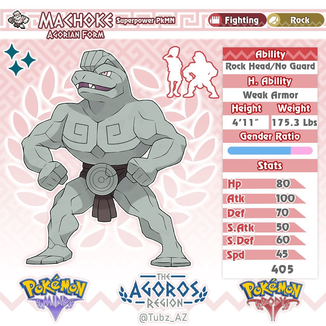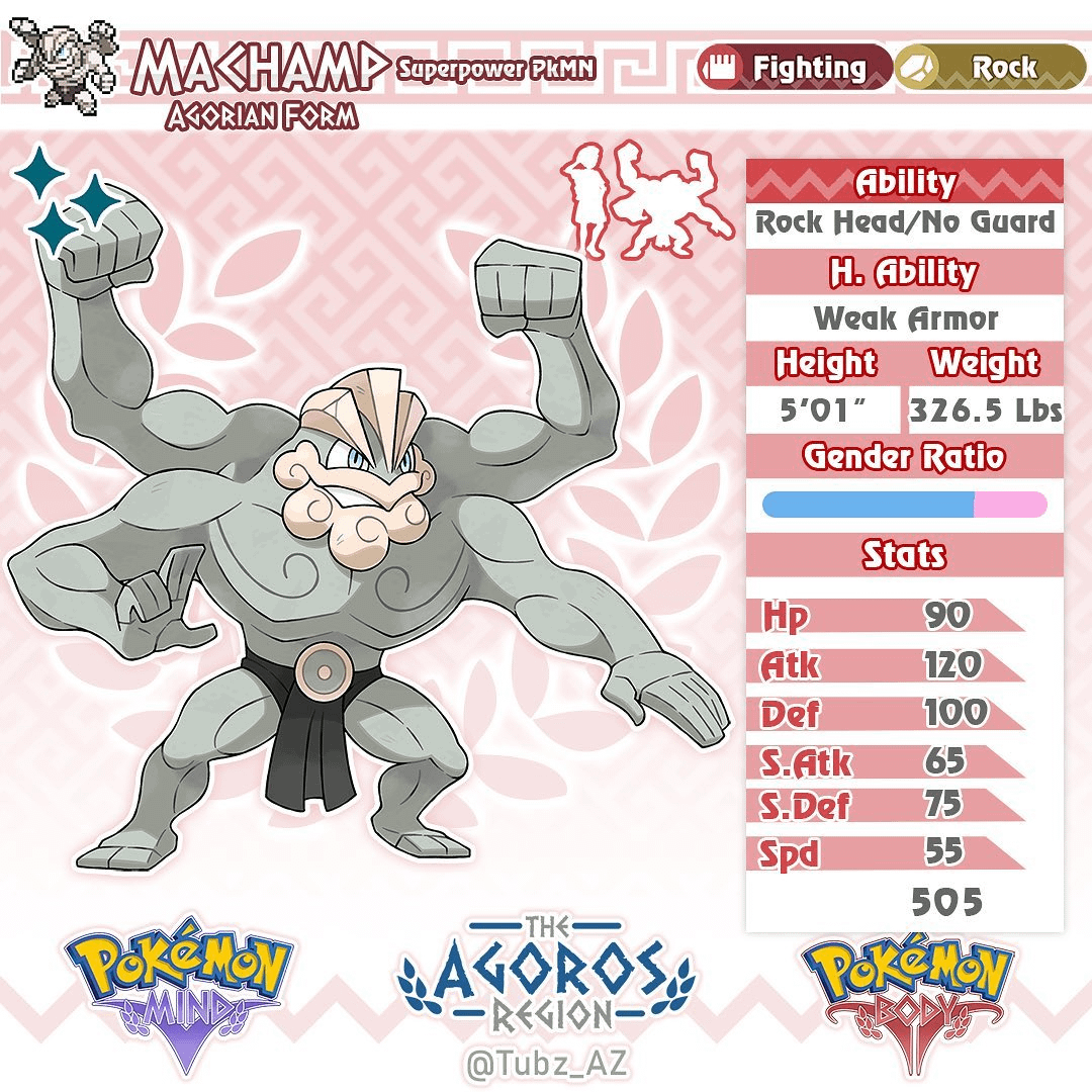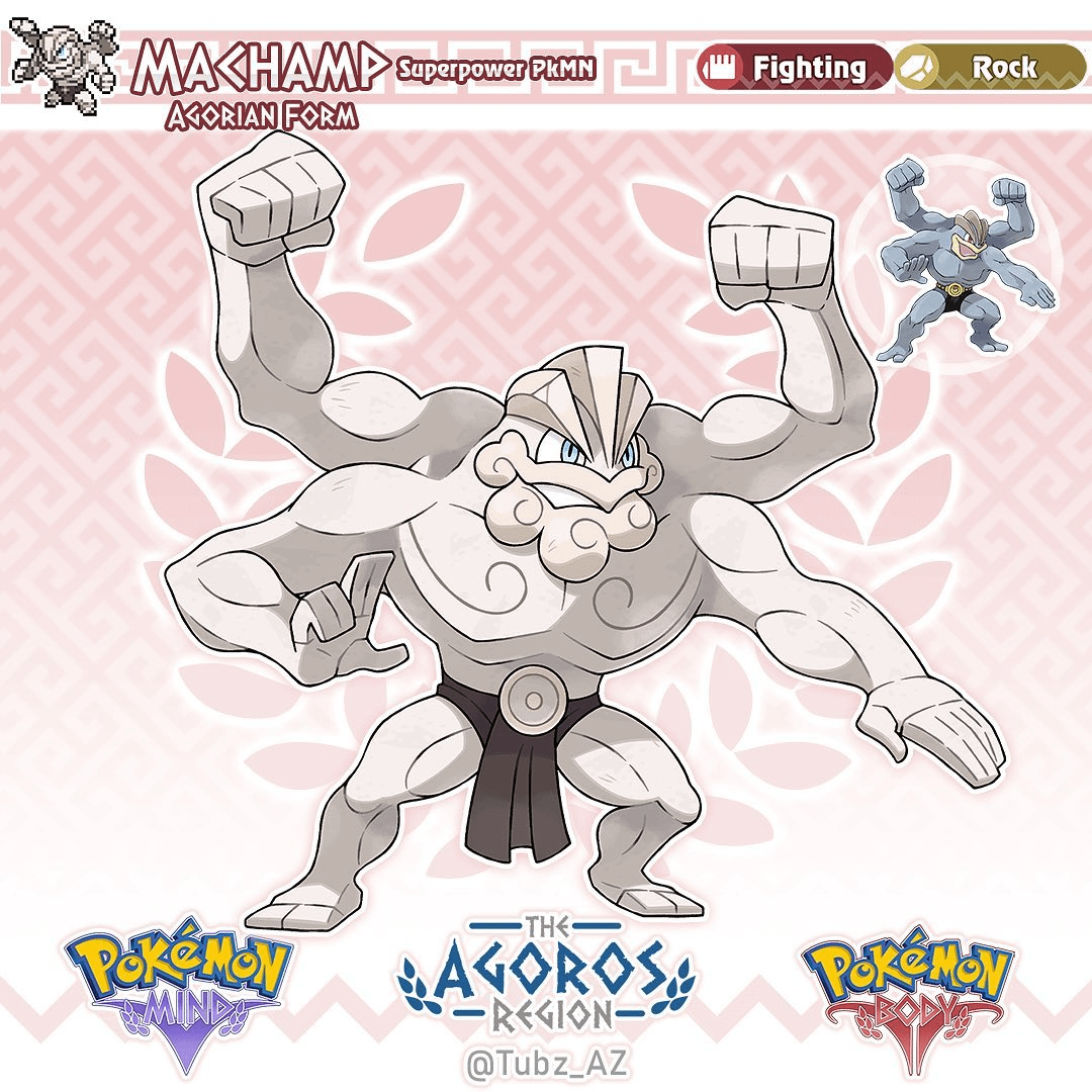 Design notes: Machamp is based on greek statues, specifically the discus, as well as many other greek busts of famous philosophers, which is why it possess such a pronounced stone beard. The whole idea of the line is that their body builders in a literal sense, as they evolve they shape there bodies until they’ve perfected their craft and become completely smooth like Machamps, this also works as a fun reference to just how impressively smooth greek sculptures were