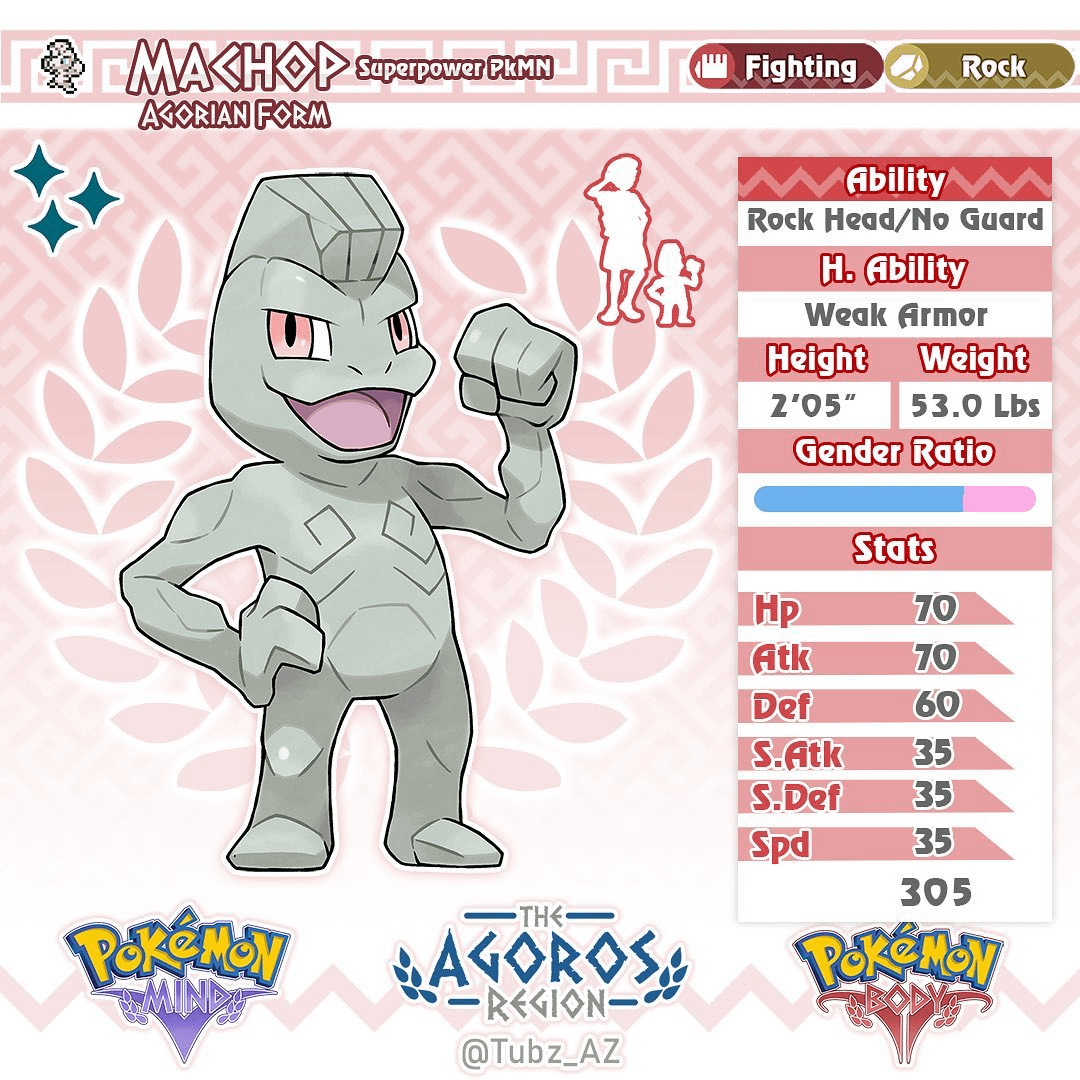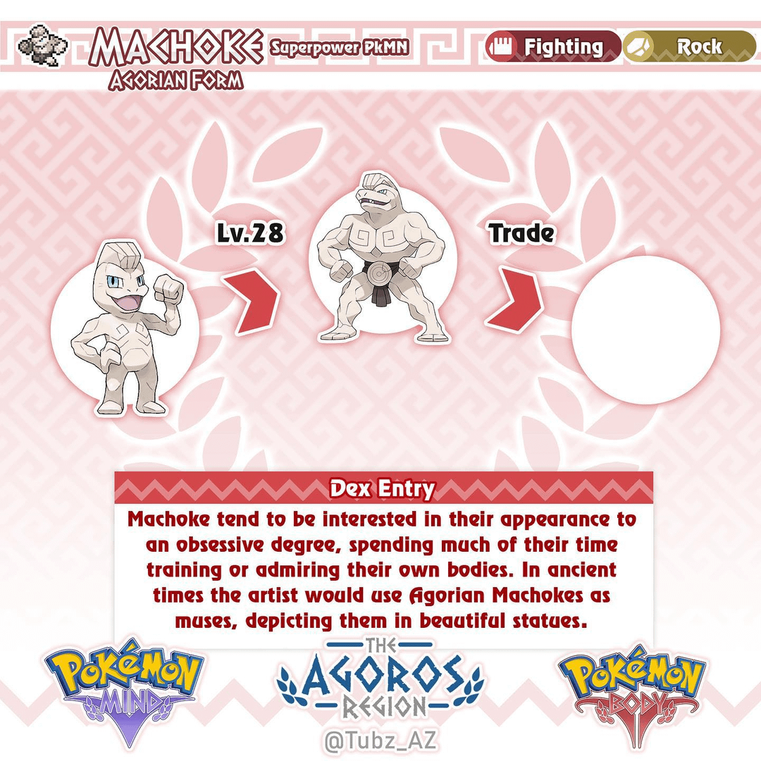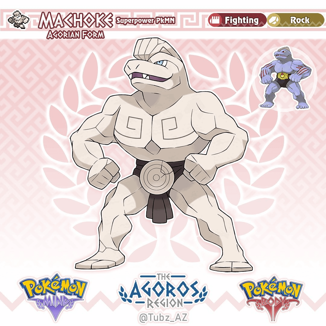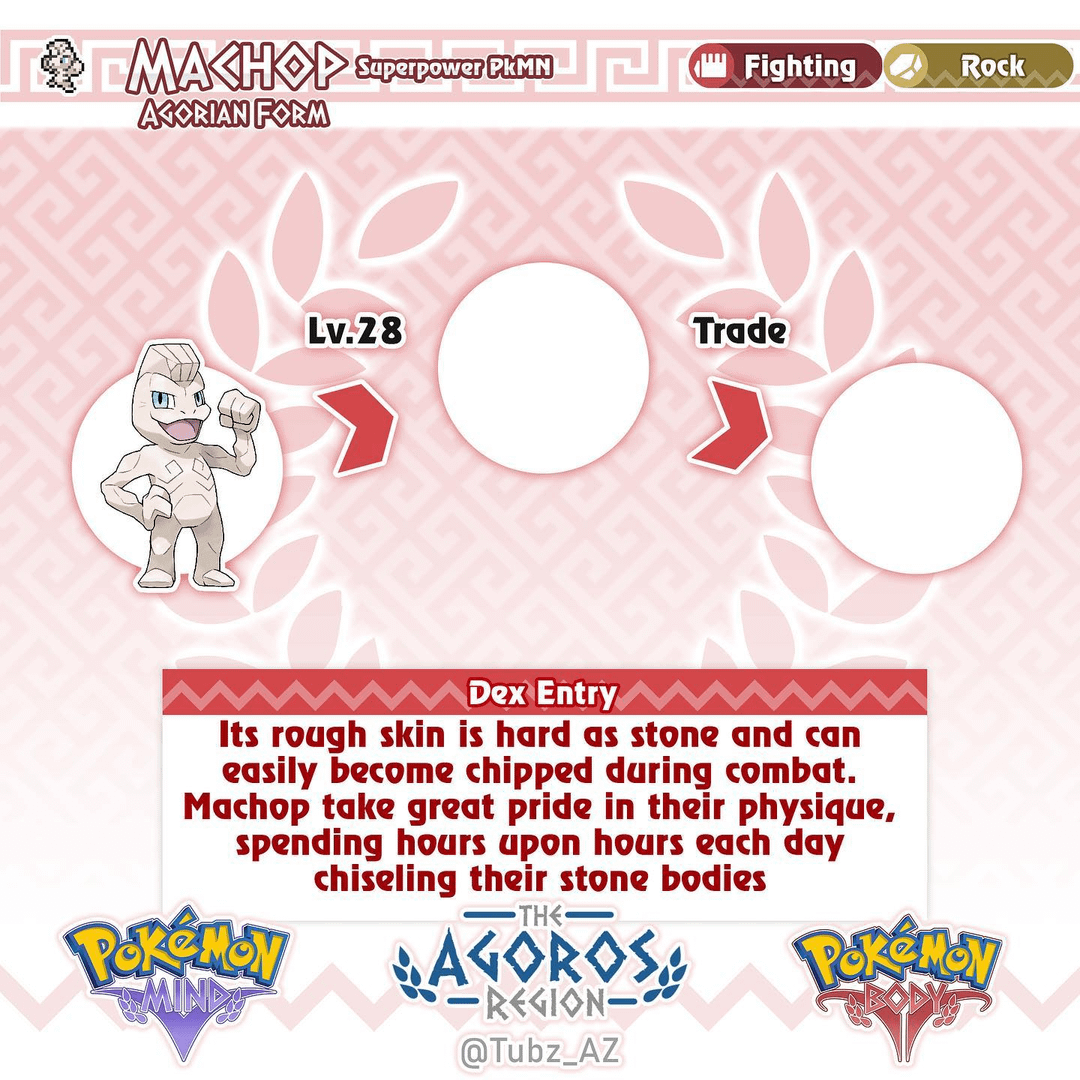 Design notes: Agorian Machop is based on Greek statues and Marble. I designed this form to be relatively similar to Alolan Geodude where its mostly the same with some minor differences. Another small design aspect is machops actual body being very rugged and random, much like rocks. this plays into a smaller them as it evolves, but that will be more apparent in Machoke and Machamp
