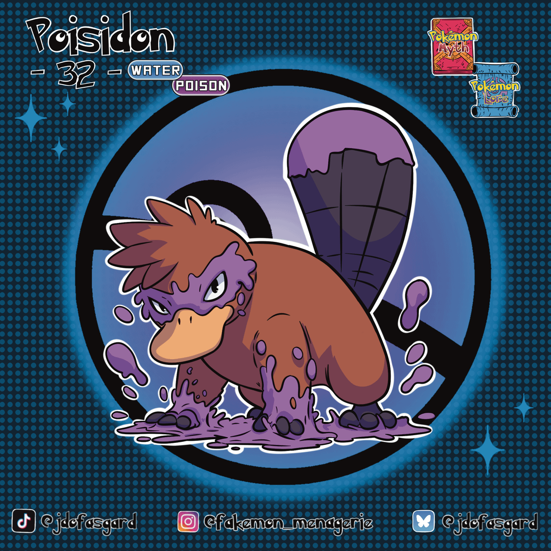 Poisidon is inspired by the biology of the platypus. Its Water/Poison typing highlights the real-life venom found in platypus spurs, while its role as a rival to the beaver-inspired Damsel(another Pokemon in my region's Dex) creates a classic "builder vs. wrecker" dynamic. Its shiny design is a Perry the Platypus reference.