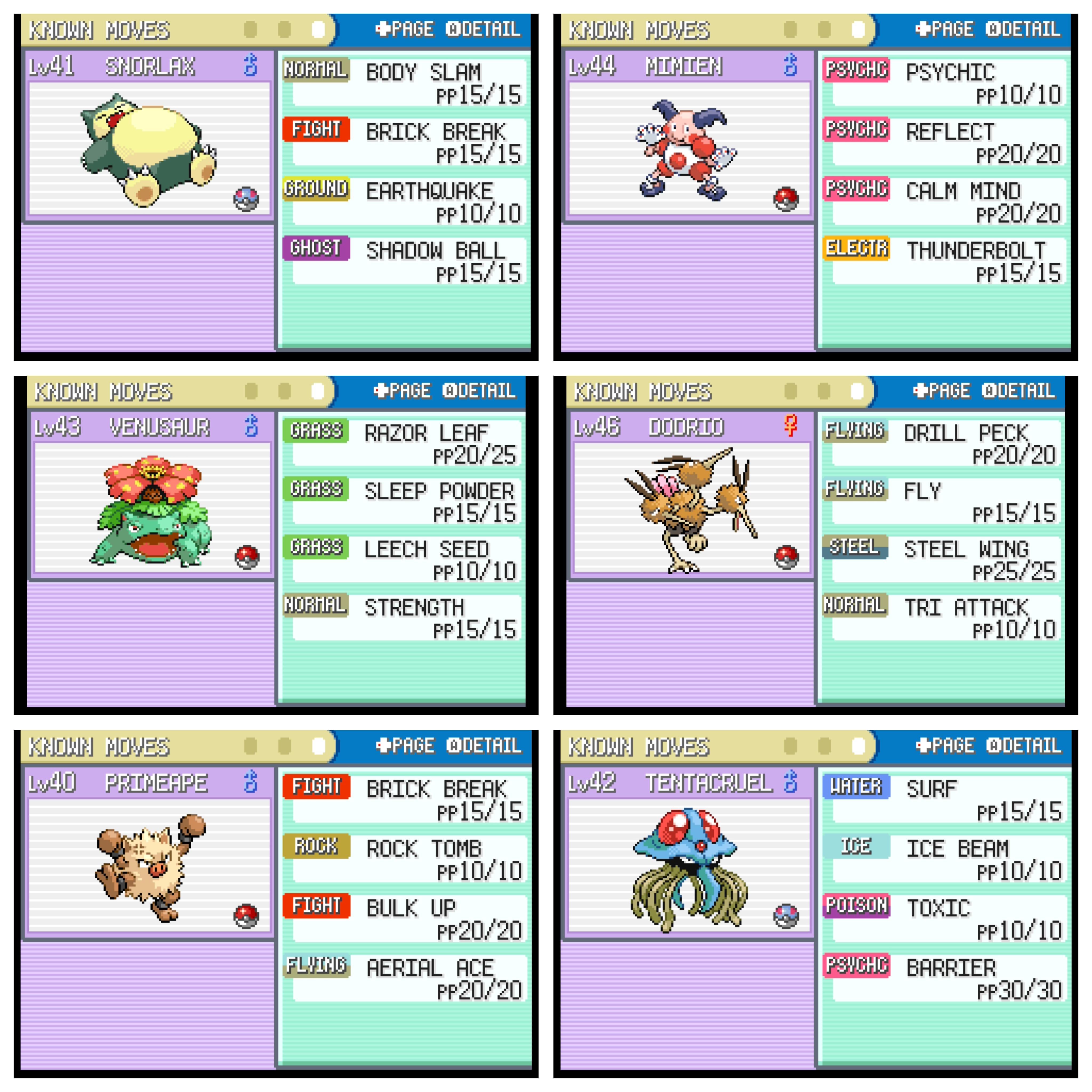 Will eventually give rock slide to Primeape and curse to Snorlax (but that involves breeding), will do that when I complete the game and start focusing on EV training/natures. Despite playing Red and Blue when they first came out 30 years ago, I've never used Primeape or Mr Mime so this was a fun team!