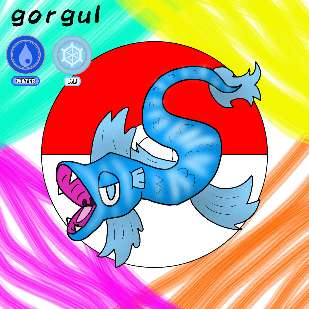 gorgul its a long giant eel pokemon, its based on ogopogo, the moray eel and the normal eel, this pokemon cryptid of the legends of the story, eating berries and other prey, like pokemon fish, land pokemon and the flying pokemon, special its the bait.