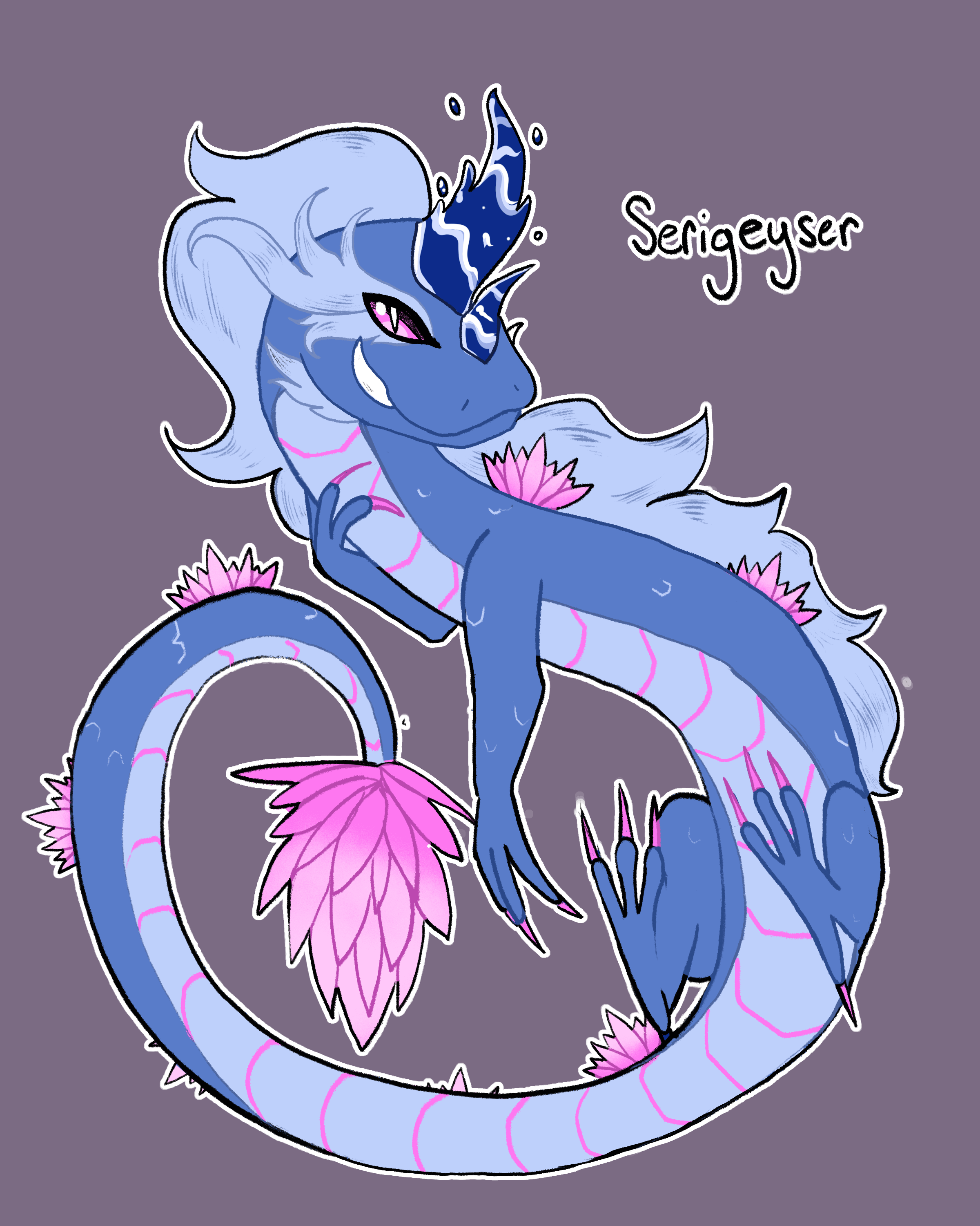 She's based on the legend of Seri Gumum, the version where she leaves the garden she lives in to be with her beloved; Then the garden floods into a lake and she turns into a naga. I thought since that legend seems so fitting, it would be a fun concept! Plus adding water lillies let me keep a highly feminine design and play around with the pink she already has<3