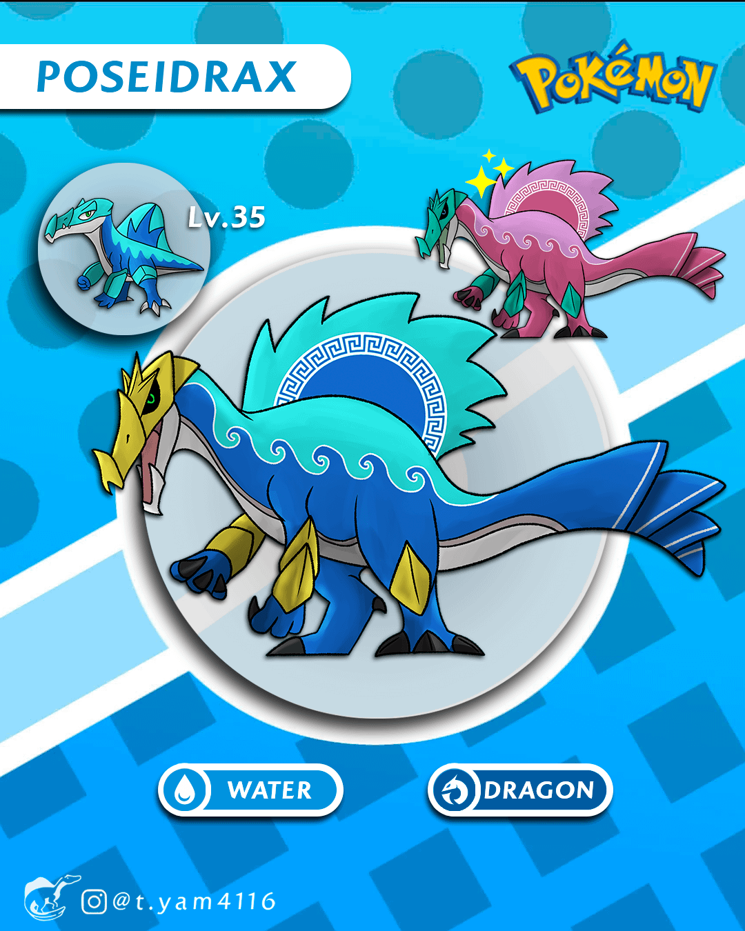 It evolves into Poseidrax at level 35, gaining the dragon typing. Based on the Greek god Poseidon itself, it evolves hard golden structures resembling the ancient armor of past civilizations. It's a master at diving and pretty fast underwater, but a little bit clumsy at land. It's jaws are powerful and with razor sharp teeth, perfect for catching fish and other slippery prey.