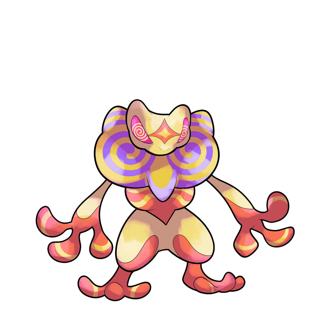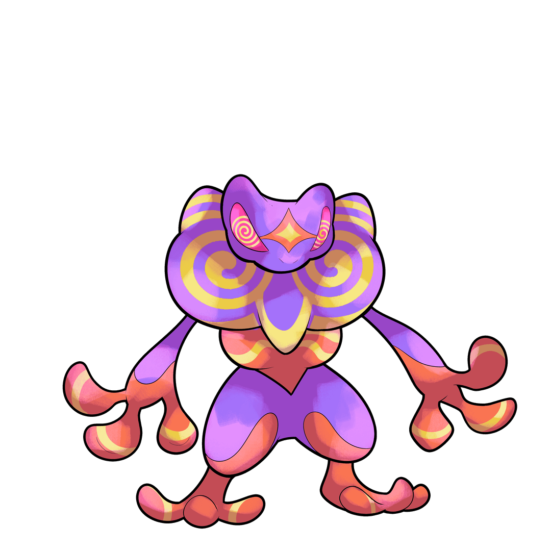 Croakedelic produces a far stronger psychedelic toxin than its pre-evolution. The swirling patterns on its body constantly shift as it releases vapors that disorient both Trainers and Pokémon for hours, causing intense auditory and visual hallucinations. Some Trainers claim the effects are oddly calming, though many who inhale the vapor later wake up in the desert with no memory of how they got there.