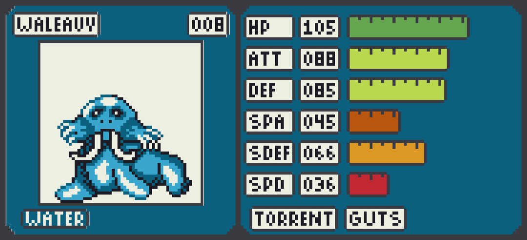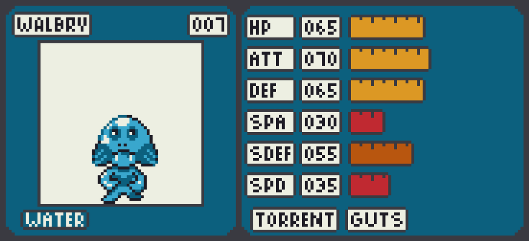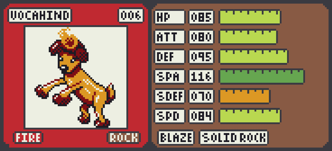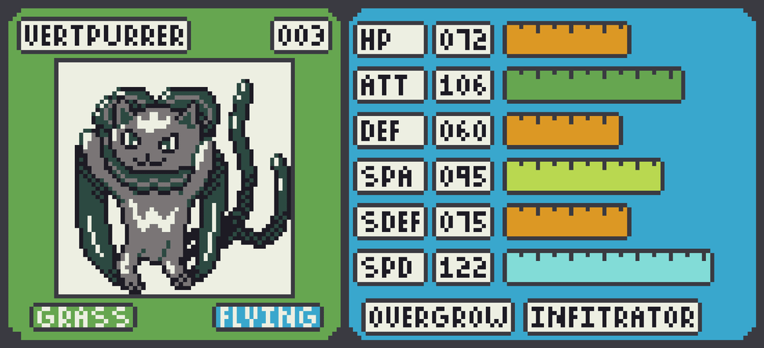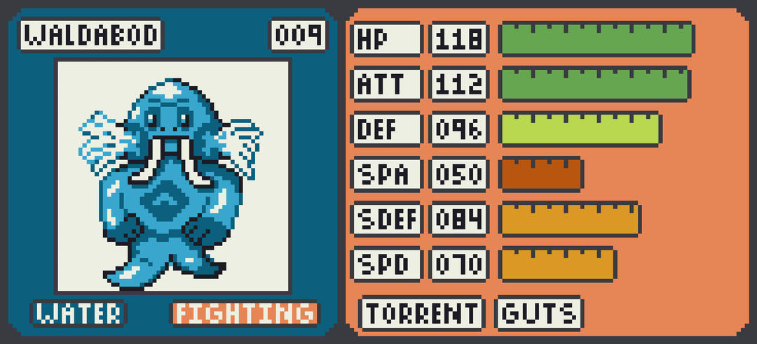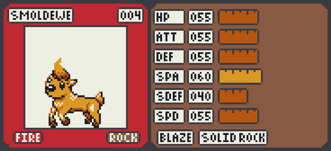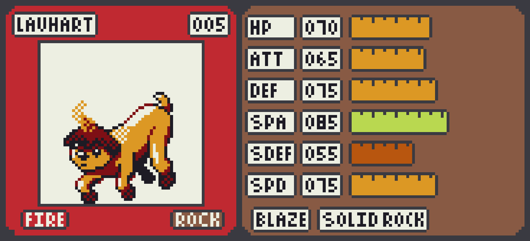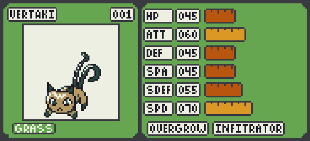 Vertaki becomes a quick physical attacker Grass/Flying Vertpurrer with a focus on utility, including the Infiltrator ability. Smoldewe stays fairly balanced growing into the Fire/Rock Vocahind which boasts a usable special attack stat and defenses that can be bolstered with Solid Rock. Walbry muscles up into the Water/Fighting Waldabod who is more defensively oriented but can pack a punch with Guts.