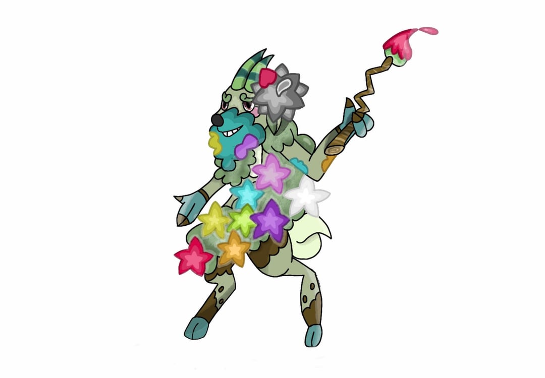 Caproulortist stores different types of nectar in his flowers on its body. Each nectar produces a unique color and scent, which it uses to paint patterns with meanings only other Caproulortist seem to understand. Trainers often find their campsites covered in colorful patterns after Caproulortist passes by. His flowers eventually grow into special berries that are considered some of the most delicious in the world.