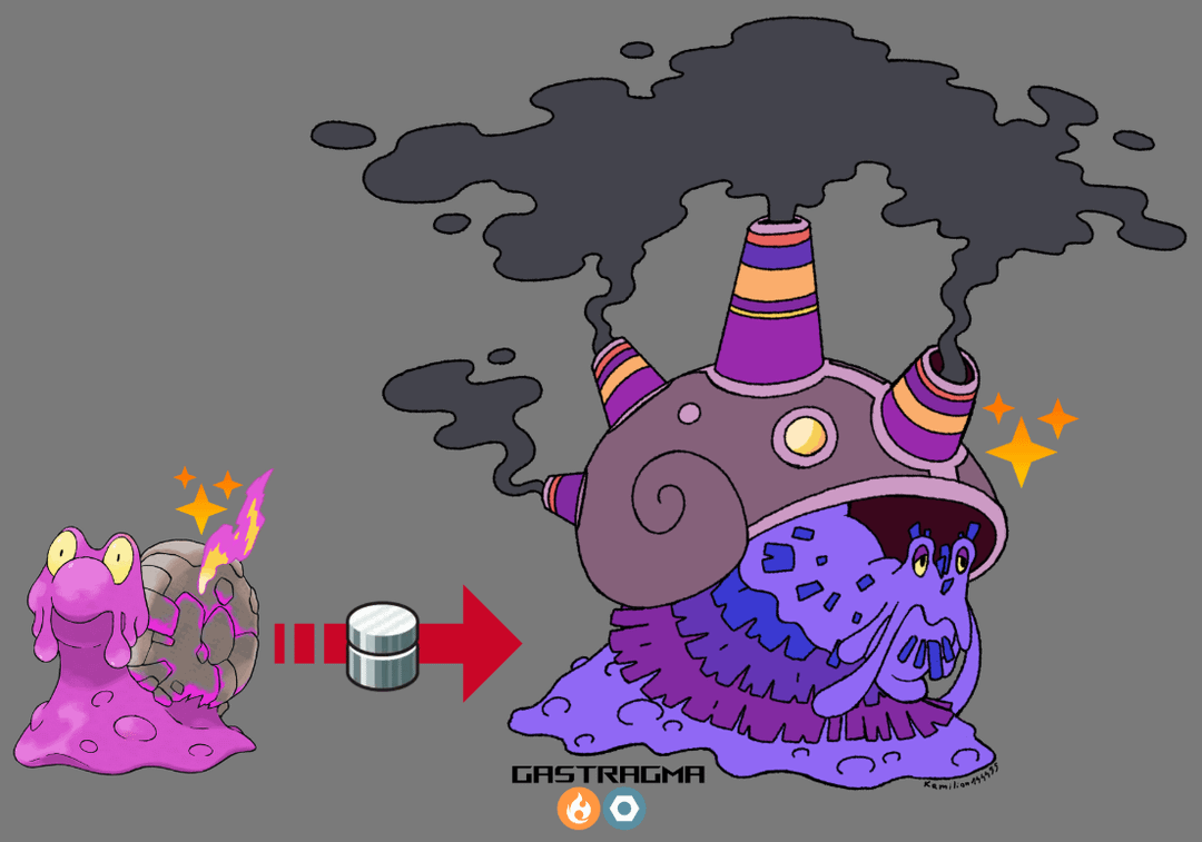 Magcargo evolves into Gastragma with a metal coat. Its shell is now repaired with metals and no longer leaking out flames, boosting its energy. Gastragma is speculated to live in the earth's core. on rare occasions they can be seen crawling out of volcanic craters. its body temperature reaches 36,000 degrees F.