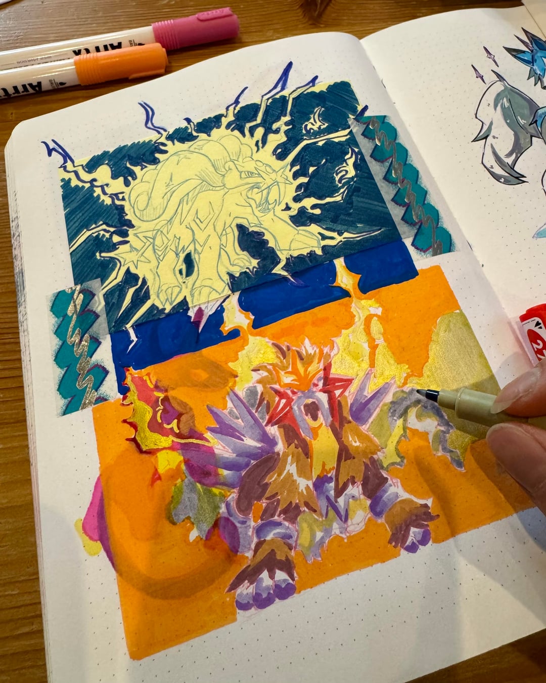 Sketchbook spread inspired by journaling and scrapbooking! I like using dry/wet mixed media, sticking things in and decorative washi tape! By u/kanaeink