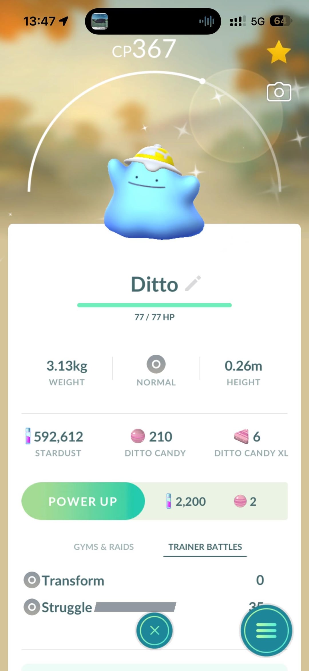 when i first returned to Pokémon GO earlier this month about 2 weeks ago, my first shiny was a Ditto, i had thought i just caught another yesterday, it didn't even register that it had a little hat on, but as i was watching a Mystic7 video on YouTube and he said costumed shiny are pretty rare.. i was like wait a minute😅