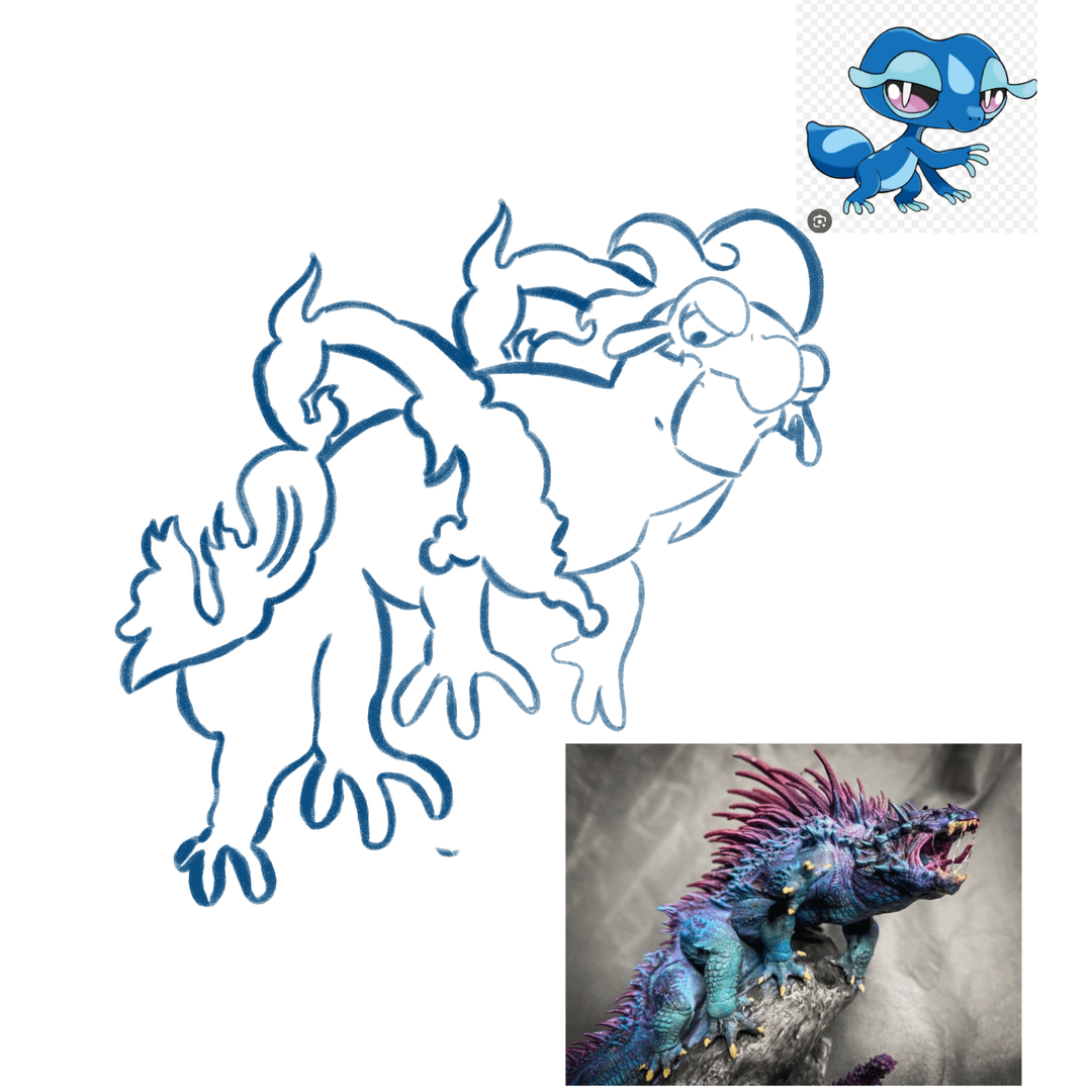 My take on Gecquas final evo He's NOT bipedal and walks on four legs, in my take he's a water type and a a dragon type even tho people say is more probably that it'll be a water type and posion type dunno His leg is kinda weird cuz I basel myself on the that pic (can be seen in the next one)