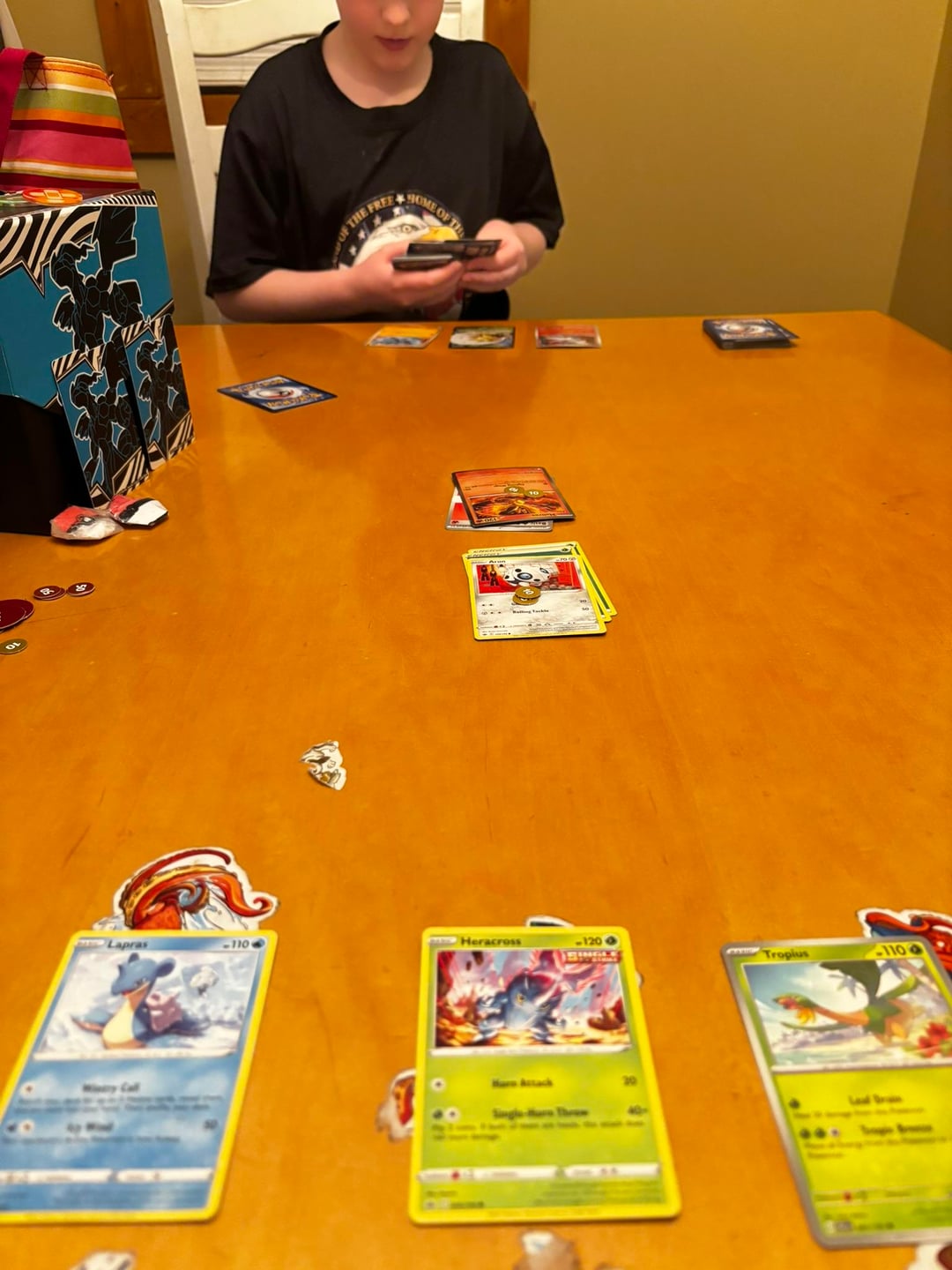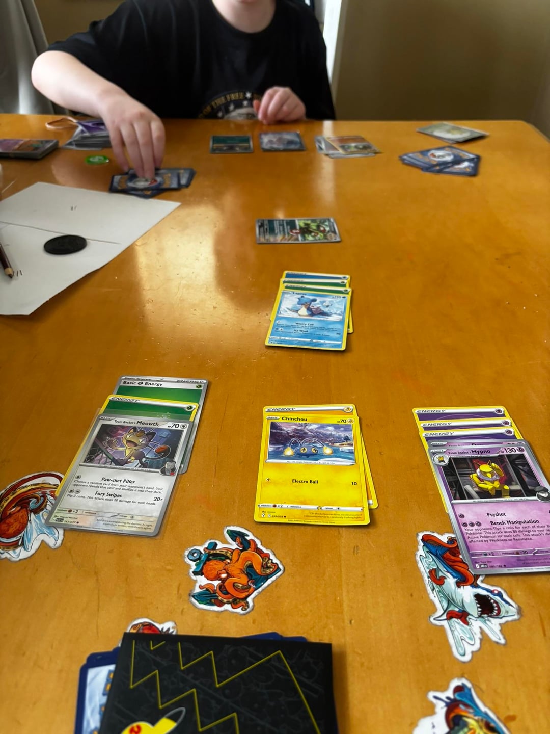 Side note: we played Pocket rules (no prize cards, unlimited energies and 3 card bench). More fun for the little guy that way. Don't have time for a regulation game.