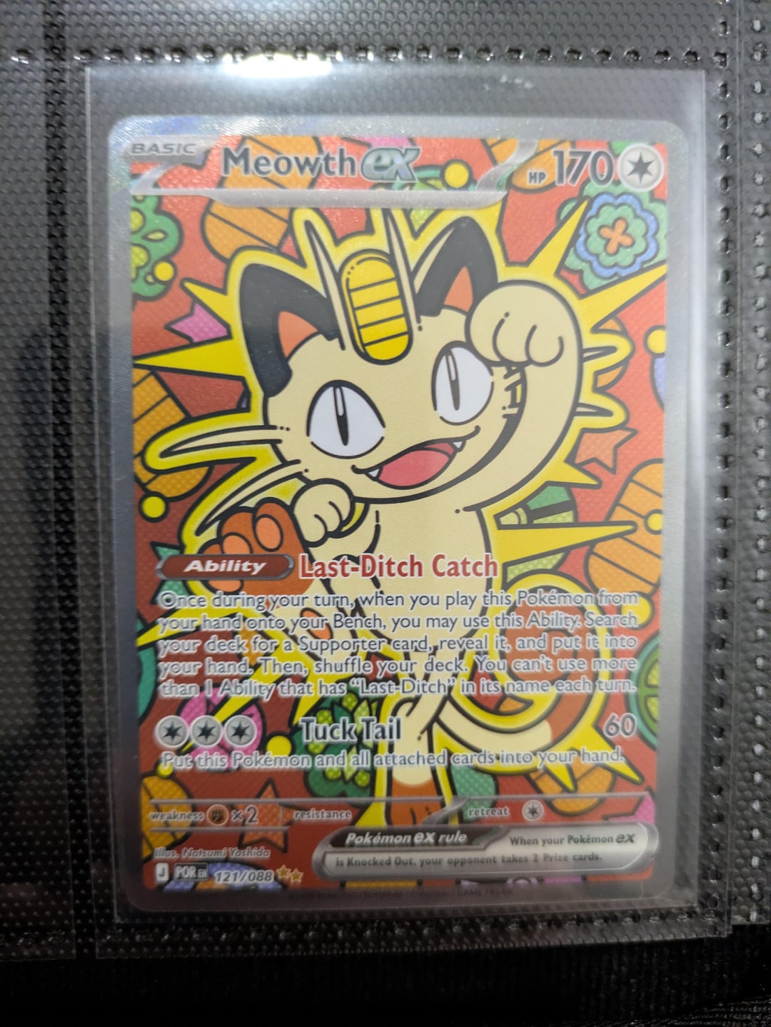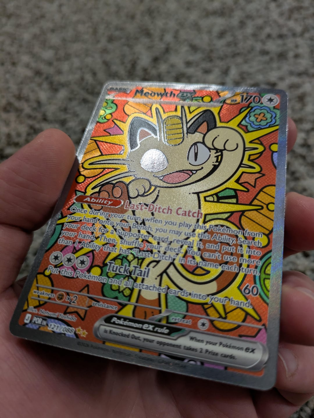 I was lucky enough to pull the Meowth ex SIR in yesterday's prerelease, and haven't seen any pictures of the English card posted here yet, so I figured I'd put some up! It looked fun from the online art, but in person it's far more impressive because of all the texture.