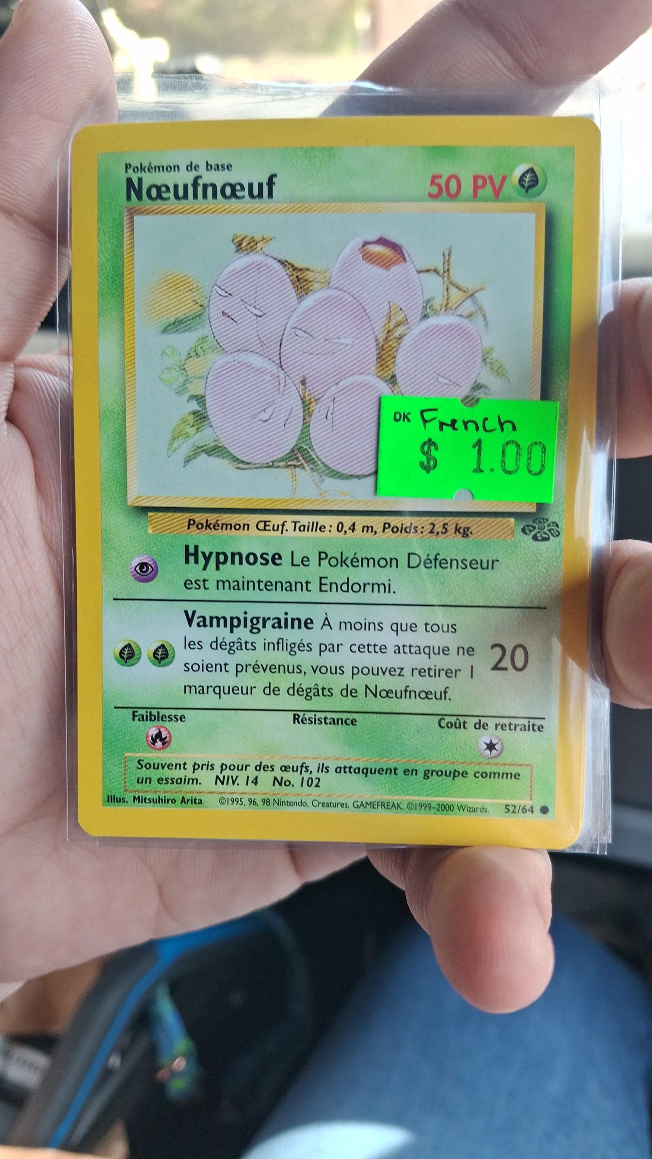 found this random French eggsecute in a bulk bin and thought it was funny. I had to get it, and I'm realizing now that there's very little information on these cards out there really. TCGplayer has almost nothing on any french card so I thought it was really interesting. I was joking with my friends that I get to set the market price xD
