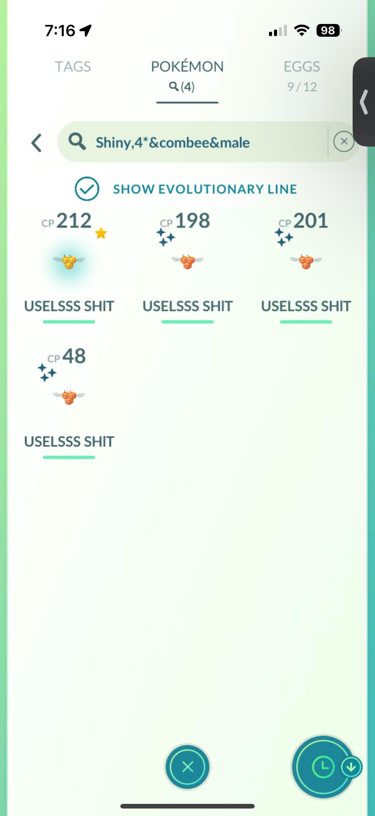 The female odds are 1/7 for Combee. So there is a 6/7 chance (don’t do it) that your Combee is USELESS. AHHHHHHHHHHHHHHHH. Do I transfer them for sport, or bait out my little cousin? by EthanKnowsNothing Write A CommentYou must be logged in to post a comment.