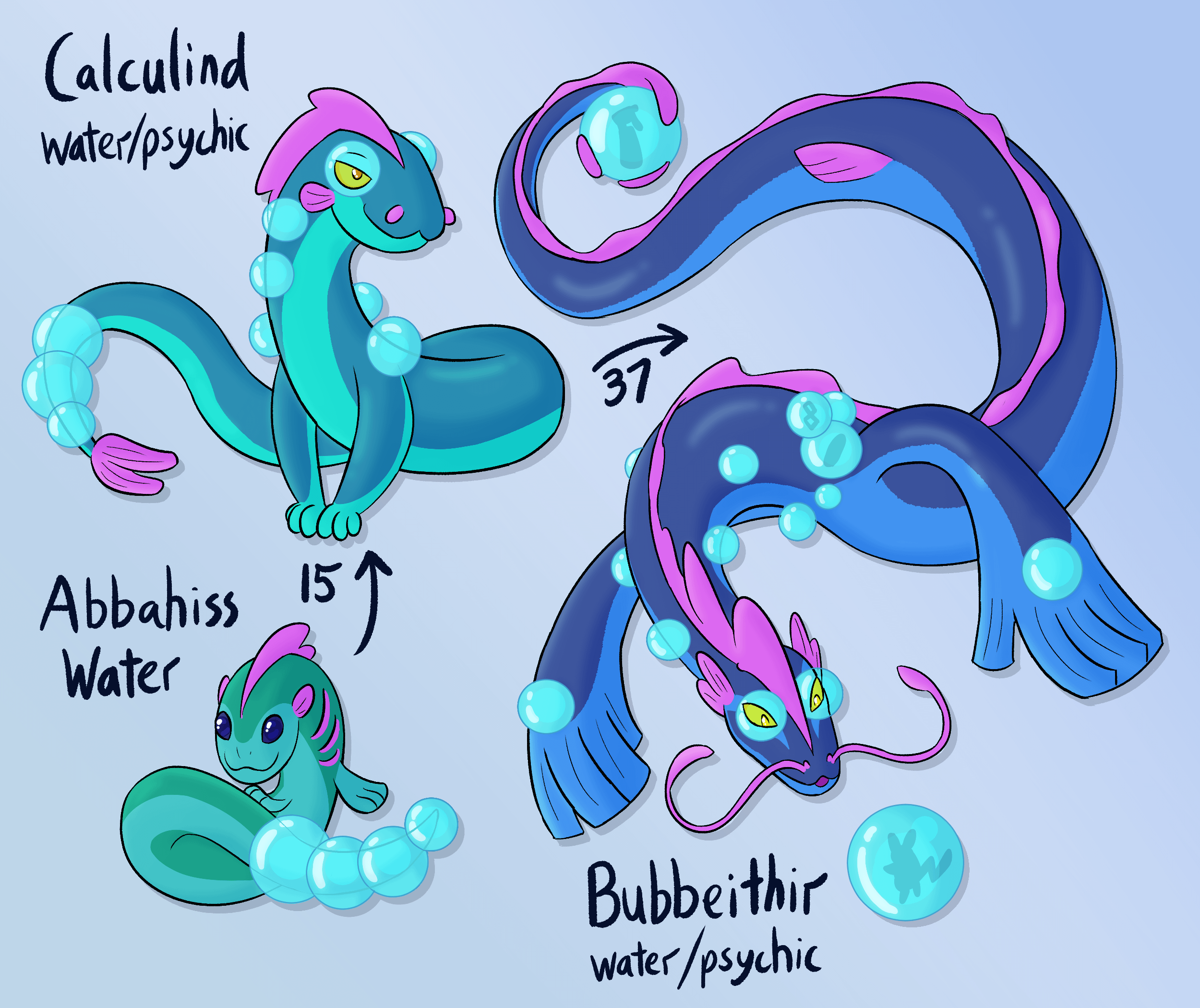 Second set of starters, this time I wanted to draw on legends of the Beithir, Lindworm and such, which might have fit a Dragon or Poison type better, but once I started leaning into 'adder', I liked the bubble theme too much!