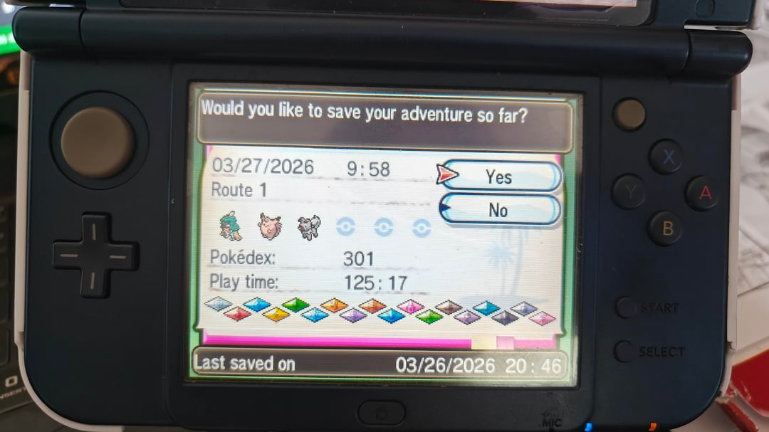 Image #1: I've had Moon and my 3ds since Christmas of 2016 when my parents gifted it to me and my sis. We loved it, played for a good while, then moved on after beating the main story and catching some more mons. Almost a decade later, I pick it up and coincidentally find out one of my college friends brings a 3ds to school often and plays often. I boot the game up again and realize I'm like, REALLY close to completing the dex. So after a few days of getting it done (I hate farming king's rock without battle tree… I did cave in eventually but I really wanted to try to get every mon through "organic" means), I finalyl traded a politoed and got the passport stamp.