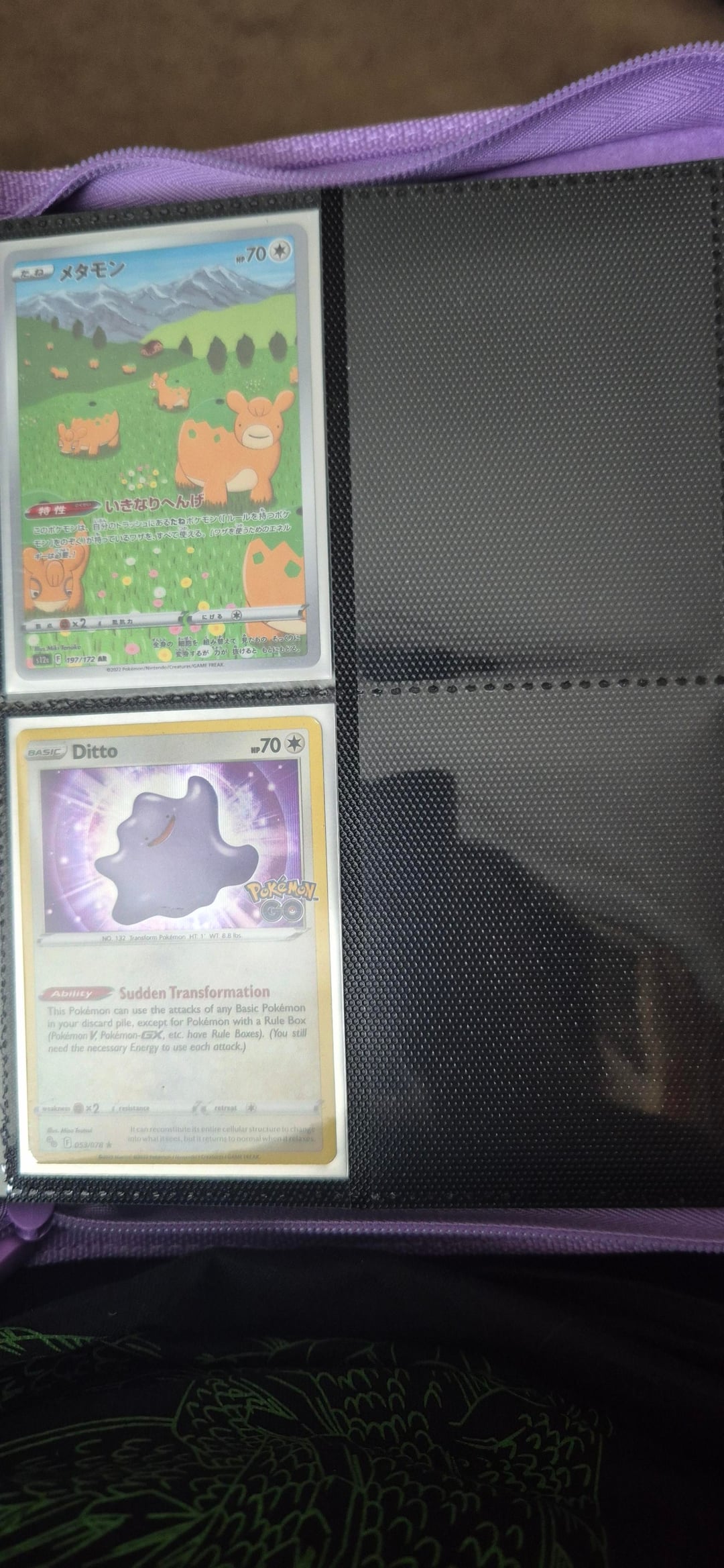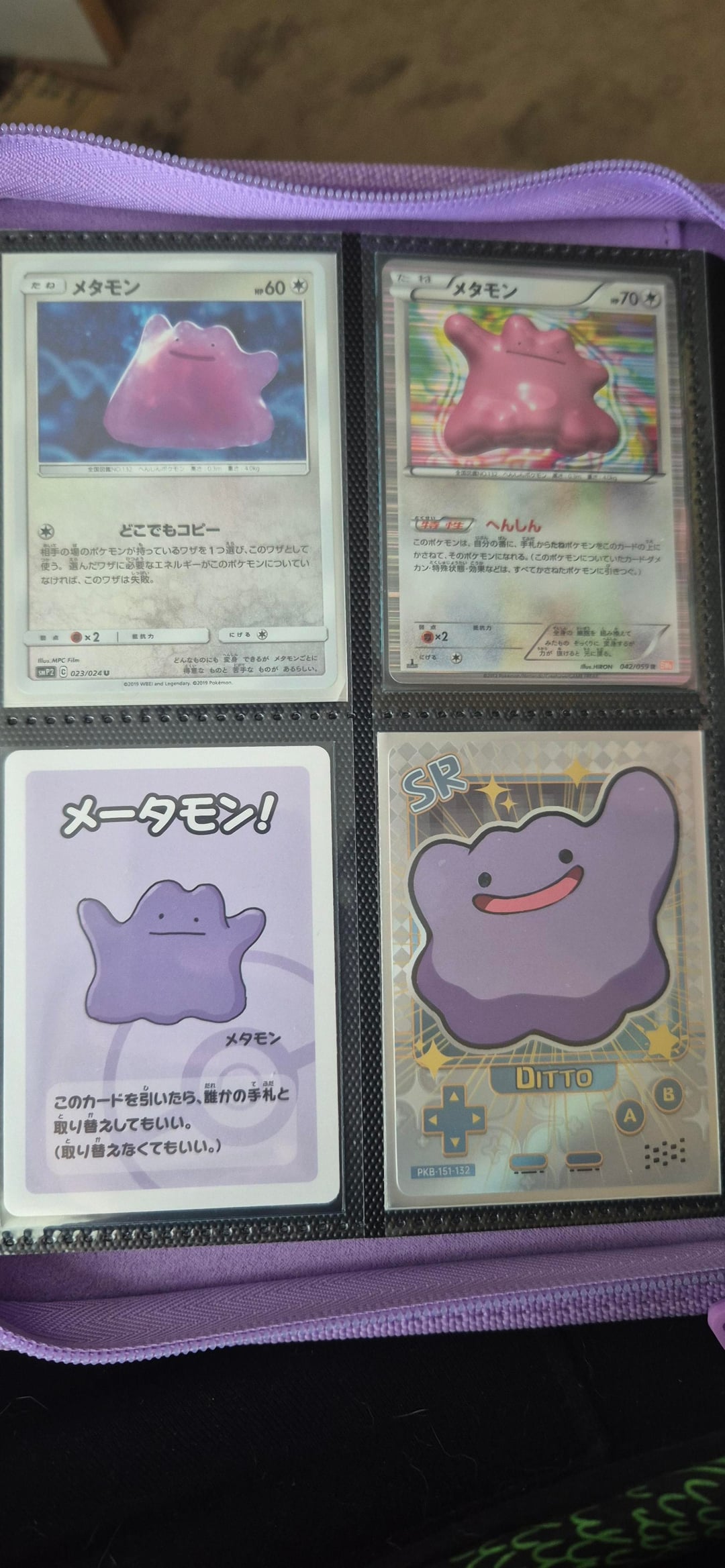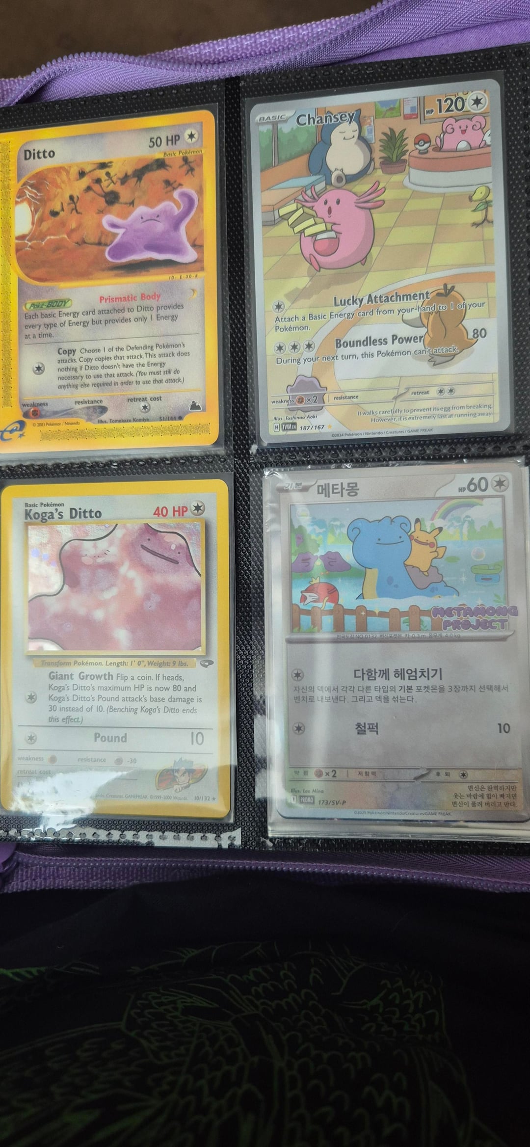 Hello everyone! I made a post last time showing off my fiancée's Ditto binder and she didn't have much Ditto cards in that post, but after a while now she has quite a lot now! We attended our first card show in Cardiff yesterday and she picked up loads of Dittos! The 151 dittos she bought 1 pack of 151 and she pulled both dittos back to back and that's all she wanted! The metamong Lapras promo she pulled the team rocket mewtwo from her first ascended heroes ETB and sold it at the card show to get that promo Ditto!