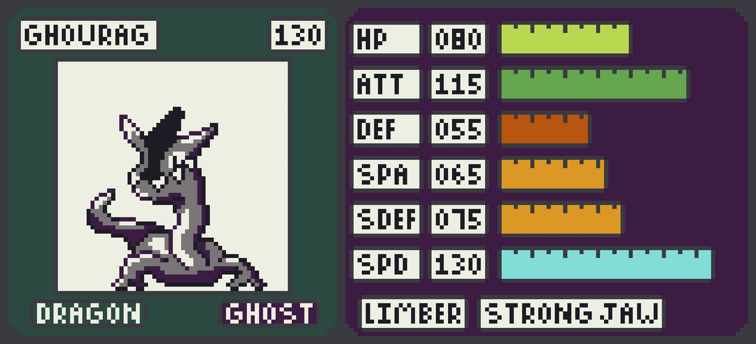 Last for the cold North is Ghourag, a single stage Dragon/Ghost. With blistering Speed and solid Attack, Ghourag haunts trainers and Fakemon alike. Limber is a good utility ability, but Strong Jaw really shines on Ghourag.