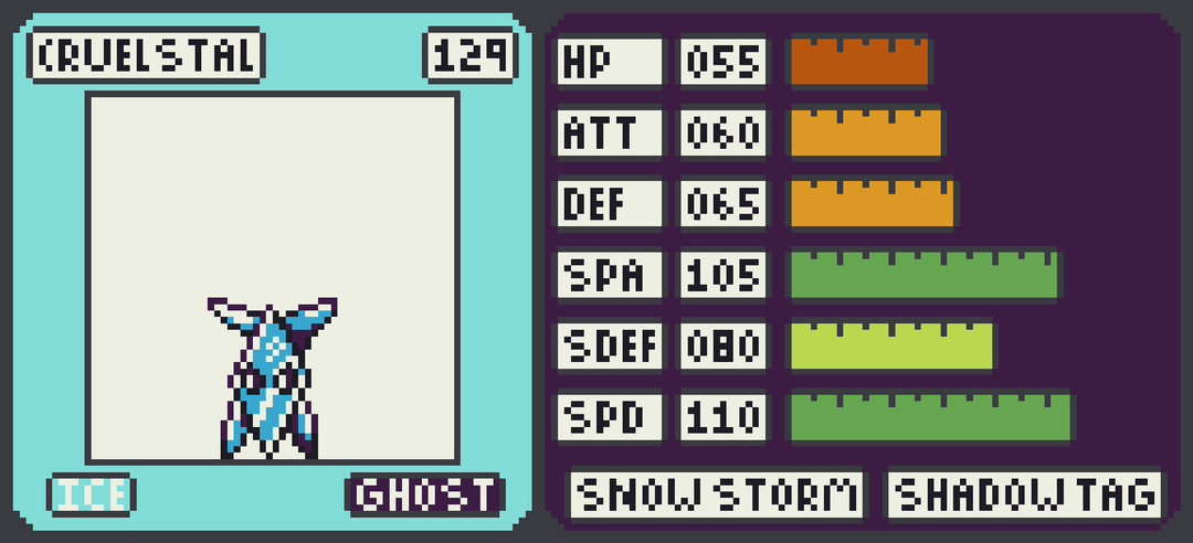 Cruelstal is an Ice/Ghost single stage vengeful ice shard. Its primary draws are in its abilities Snow Warning and Shadow tag, but its has reasonable enough Speed and Special Attack to contribute directly.