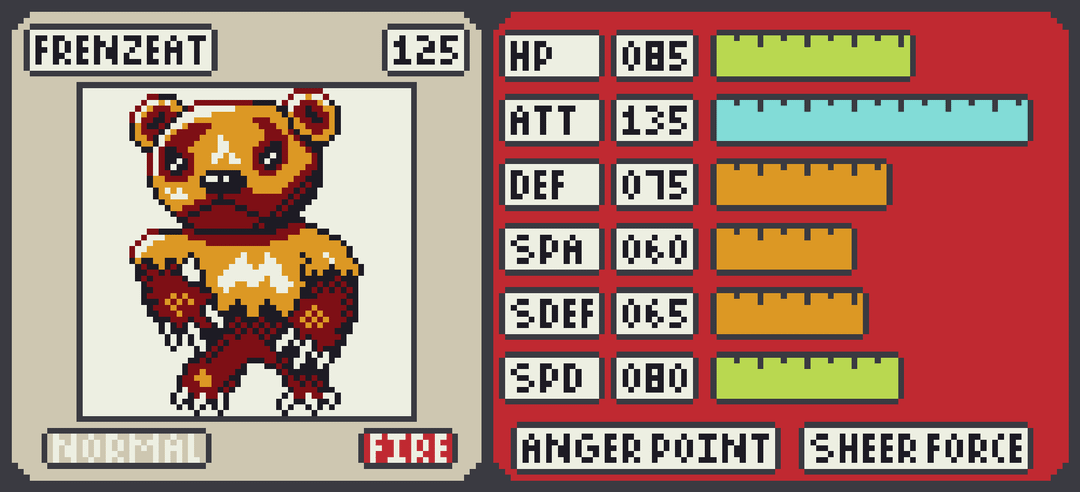 Here we are with Part 2 of the Tundra Fakemon. Starting things off is Cubzy, a cute Normal bear with big potential. It evolves into the Normal/Fire Frenzeat which has a massive 135 Attack. Its abilities Anger Point and Sheer Force are perfect for a easily angered bear trying to keep warm in the snowy North.