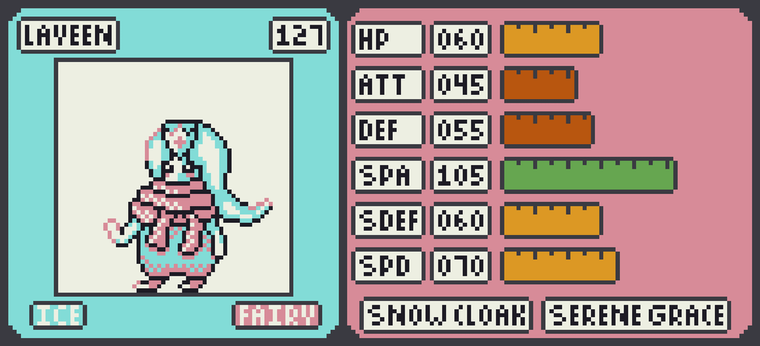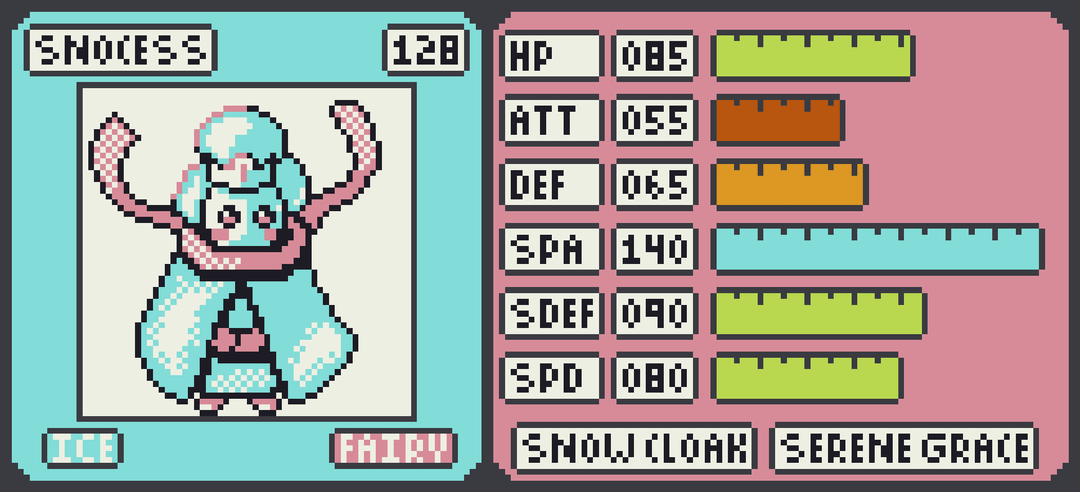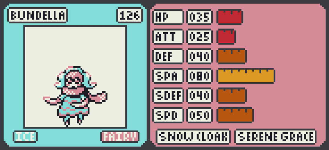 Up next is the start of a 3 stage line with the Ice/Fairy Bundella. Its unclear what exactly is under all those layers but as it evolves to Layeen and Snocess its clear that its raw Special Attack. With 140 Special Attack Snocess is more or less a delete button against anything that doesn't resit its STAB moves. Snow Cloak and Serene Grace are fitting abilities for this layered ice queen.