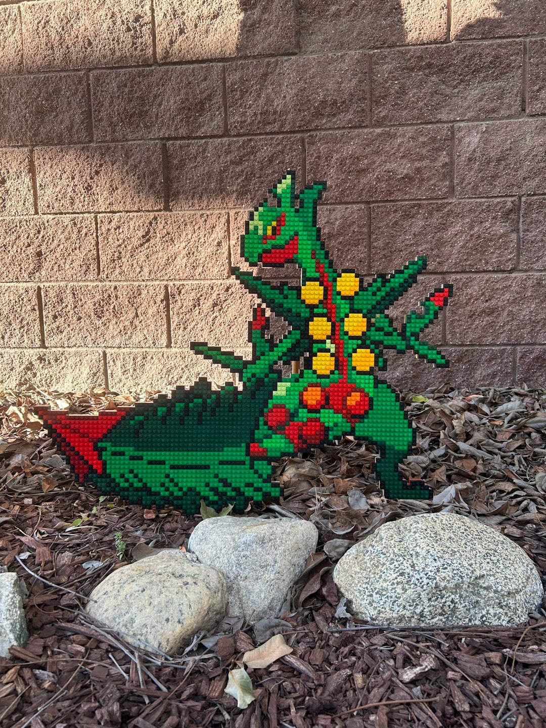 He’s one of my top favorite Mega’s. 93 studs wide and 75 studs long, he stands at just about 2 feet and 2 1/2 feet wide. And I used 10 different colors including 4 different shades of green alone to bring him to life!