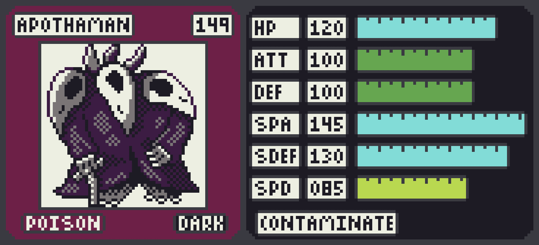 Like in many regions there is a third powerful legendary which stands alongside the box legends. Apothaman is a Poison/Dark dual type that emobidies plagues, famine, and devastation. With a stat line that features off the charts Special stats its a powerhouse. Its unique ability Contaminate causes all attacks to inflict the badly poisoned status condition regardless of the foe's type. This ensures there is nothing that Apothaman can't break down over time.