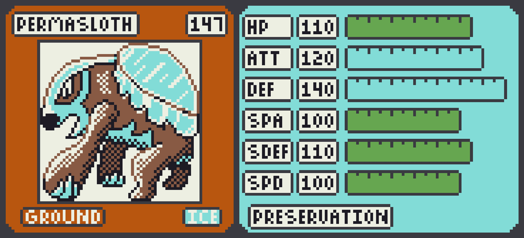 The box legends are next and they represent a divide between the impulse to preserve nature and the impulse to exploit it. Permasloth is a Ground/Ice type with huge Defense and Attack. Its unique ability Preservation boosts the power of Ice type moves. Excavaark is a Ground/Steel type with a similar statline to Permasloth but with a the balance tilted to Attack and Speed. Its ability Unearth enhances the power of Steel type attacks.