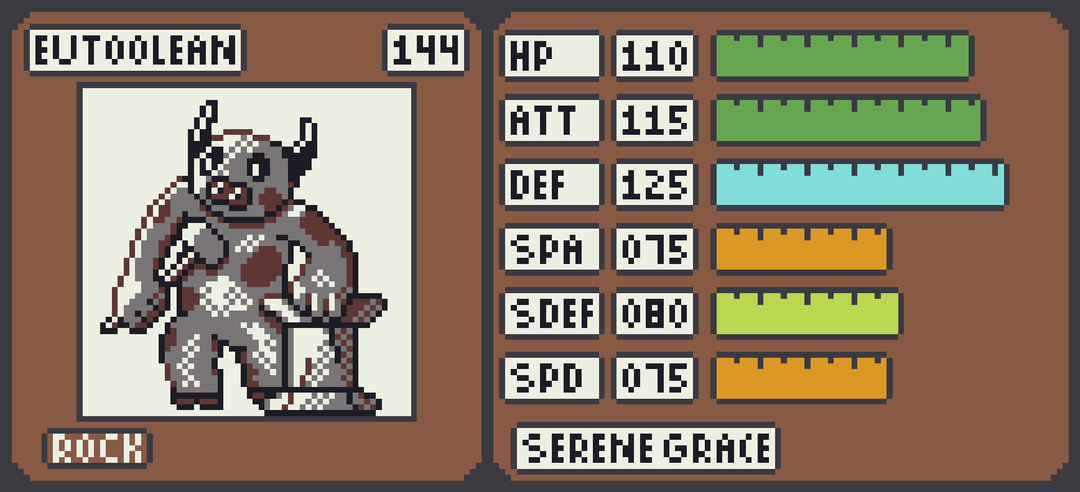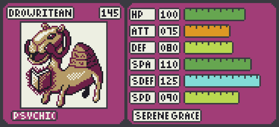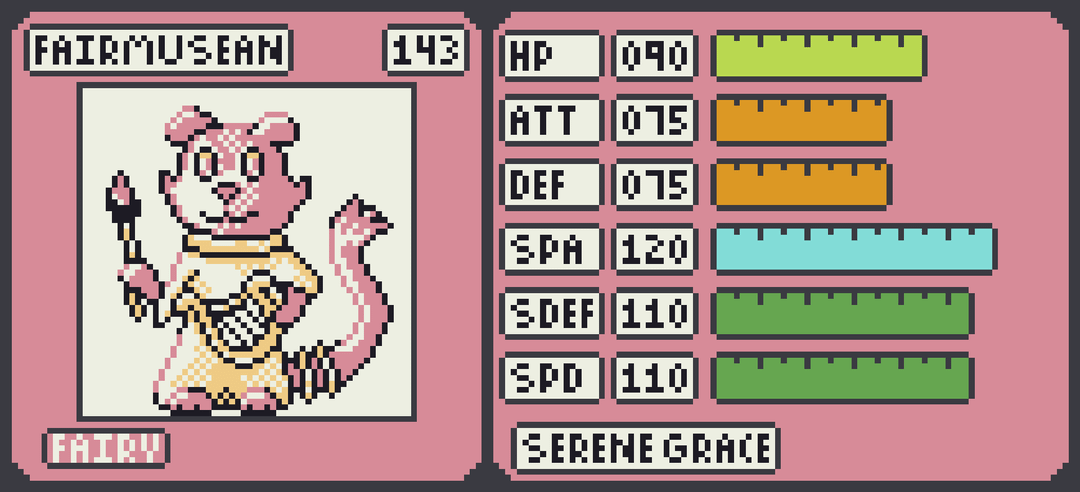 Up first is one of the legendary trio – the Fairy type Fairmusean. This trio is based around civilization and Fairmusian embodies the drive towards art, music and other aesthetic pursuits. Its a pure fairy type with good special stats. Second in the trio is the Rock type Eutoolean. This Fakemon embodies the human drive to use tools and build things. It offers a slower, phyiscally oriented statline. Last in the trio is Drowritean – a Psychic type. This fakemon embodies curiousity and the transmission of knowledge. Its stats are good all around though it favors the special side.