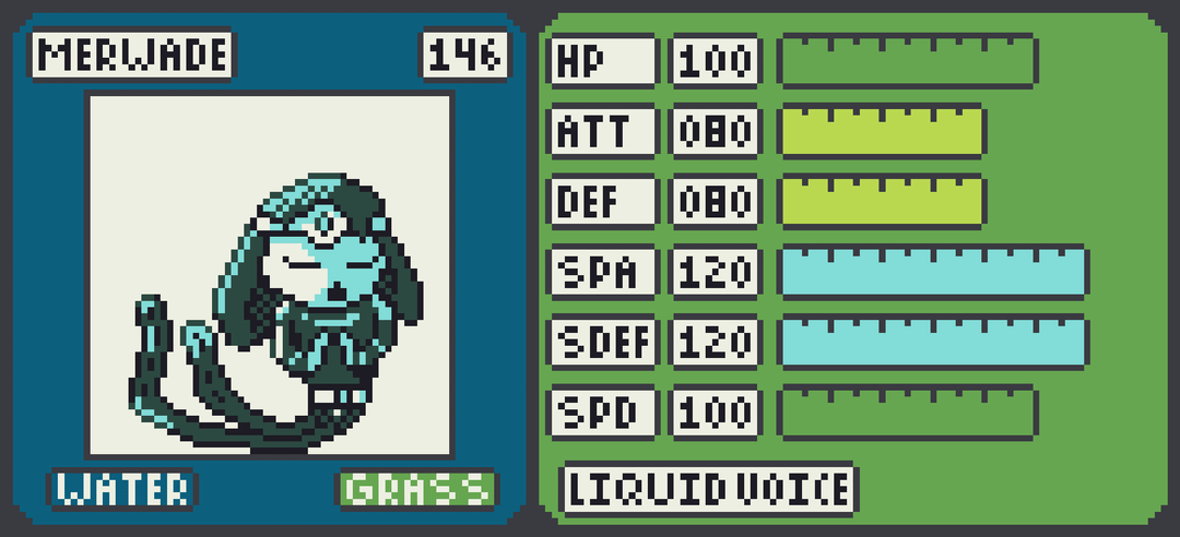 Merwade os a stand alone legendary Fakemon with the Water/Grass type. Said to bless the waters of the region, Merwade utilizes its great statline, typing and Liquid Voice ability to dominate in battle.