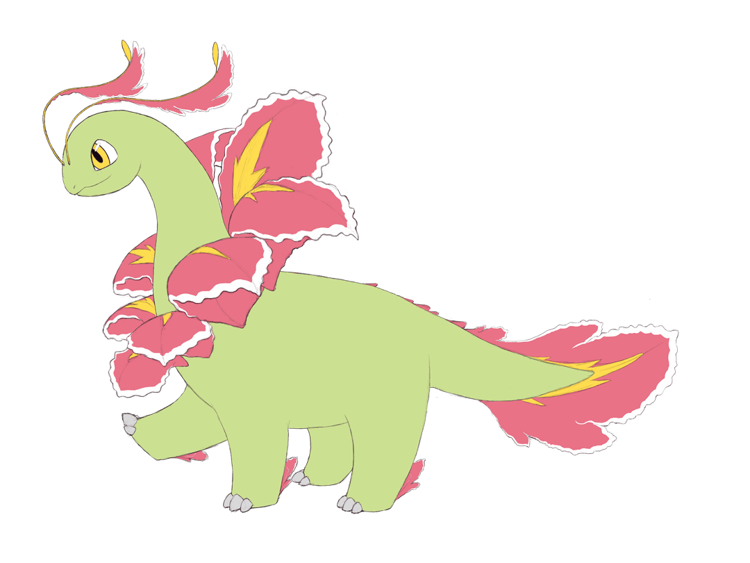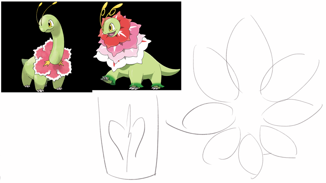 I wasn't satisfied with meganium's mega form so I tried making my own. Meganium has a very simple elegant design, one of it's key design elements is the slender neck contrasted against it's round chubby body. This visual element is lost in the mega design so I tried to bring it back here, changing the angle of the flower attachment plane to highlight the neck. The big flower was sort of inspired by those high decorative fan collars and feather collars in costumes. The extra frills on the antenna, feet, and tail were to keep it in line with mega design philosophy of "more is more". The antenna in particular were inspired by a common flower domestication mutation where stamens are converted into petals (ex: camellias), but something goes wrong and the organ ends up half way between a stamen and petal. There's 3 petals on each foot which doesn't show up well in this side perspective. I wasn't sure what to do with the tail so I just gave it a fan.