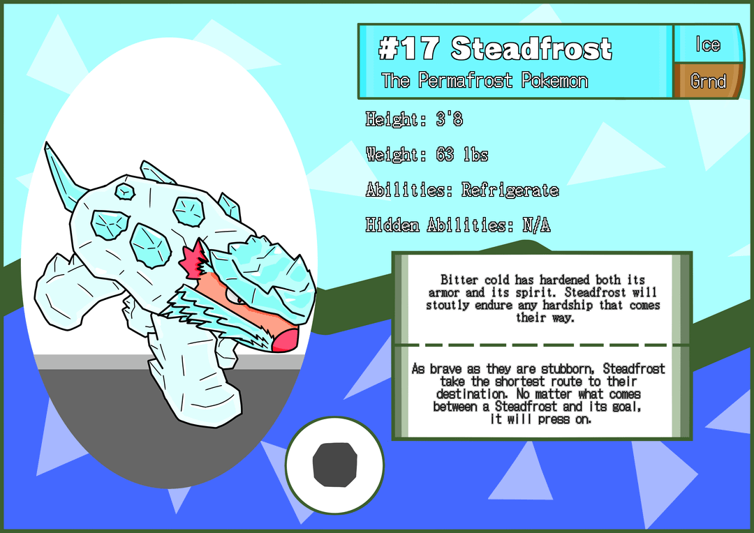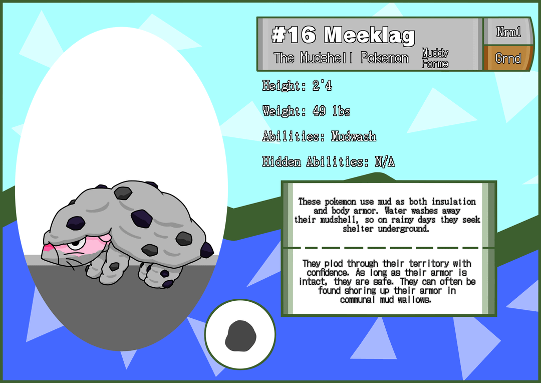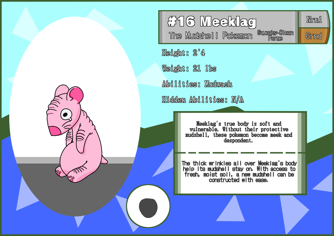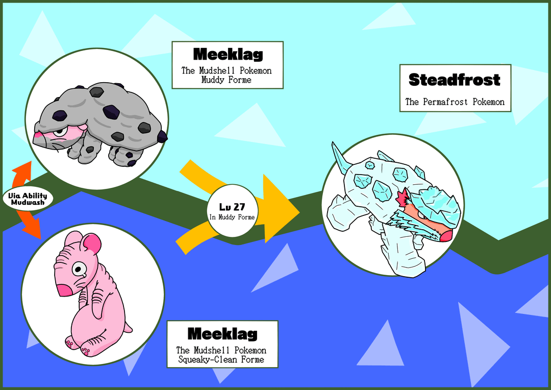 Regional rodents for my Pokemon Sea & Sky project! Meeklag is a pink, hairless mouse that anchors rocky mud into its wrinkles for camouflage and defense. its Mudwash ability would cause it to change into its Squeaky-Clean form in rain or when hit by a water move. It can only evolve while in Muddy forme, and becomes Steadfrost, with its mud freezing over into sturdier armor.