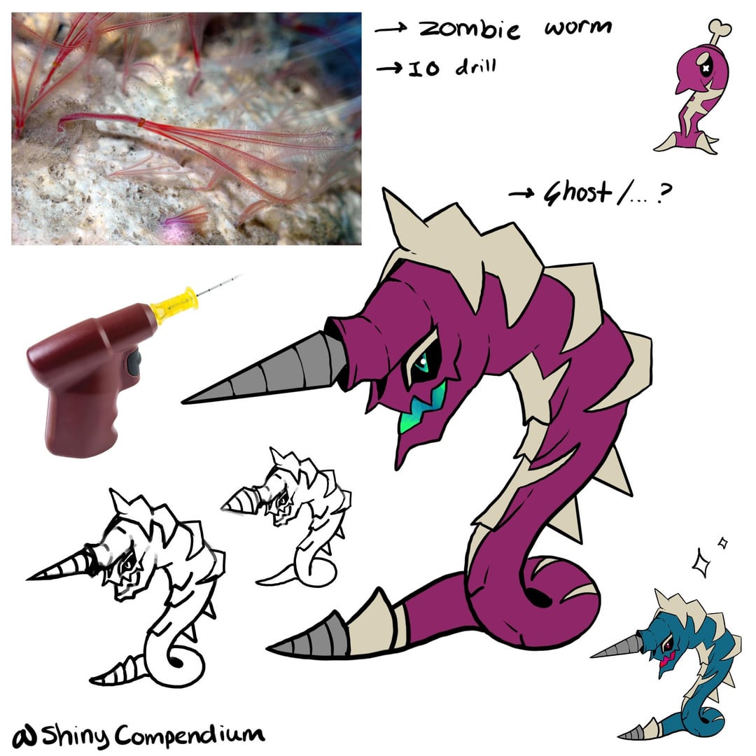 The other two are cool zombie worm inspired mons. I did these two as part of a challenge to design a fakemon in 5 minutes, and I’m happy with how they turned out! My only concern is that their types aren’t getting communicated clearly, but I intend for them to both be pure poison. Should the final evolution be Poison/Ghost, since it drills into the bones of dead Pokémon?