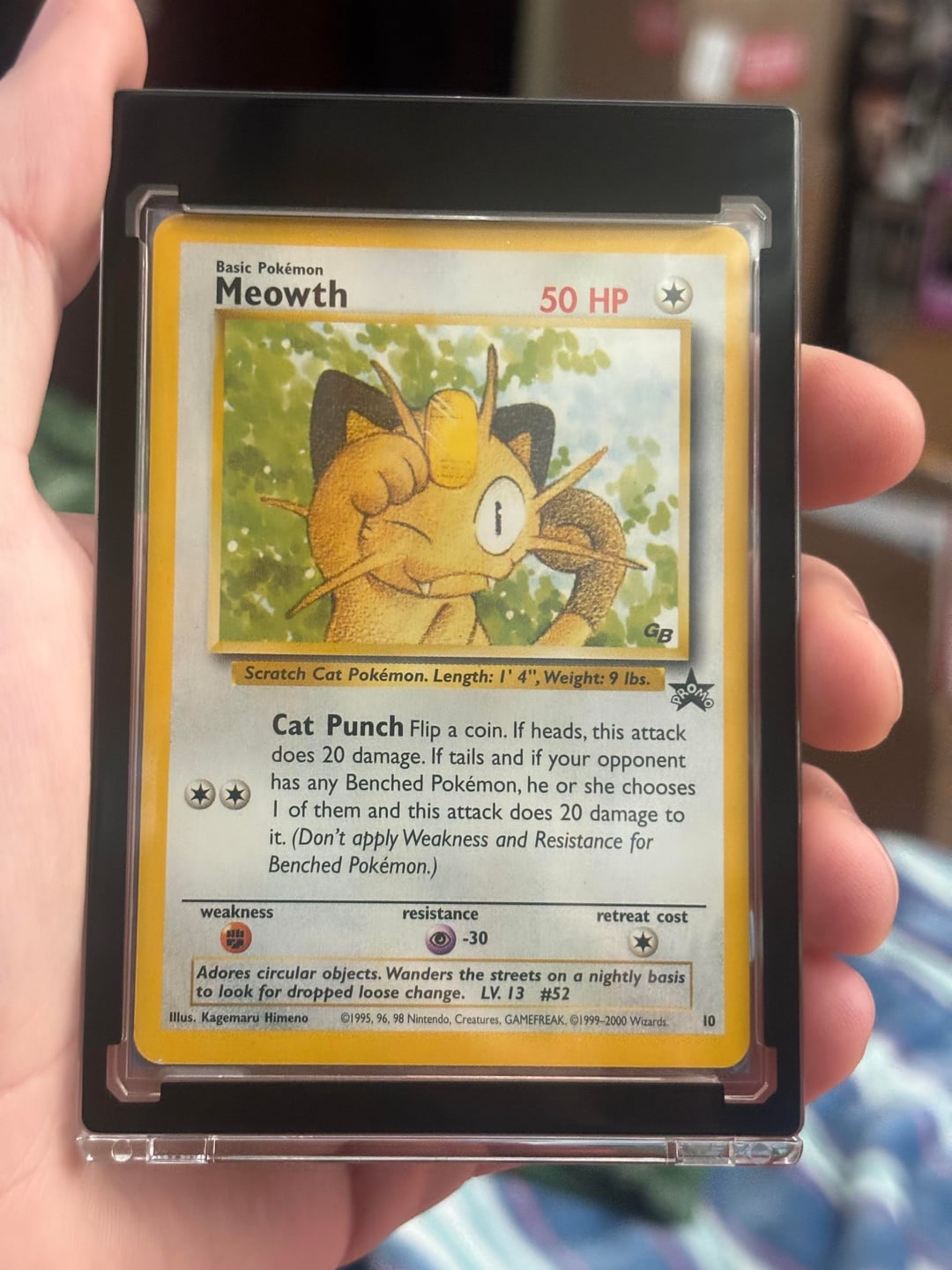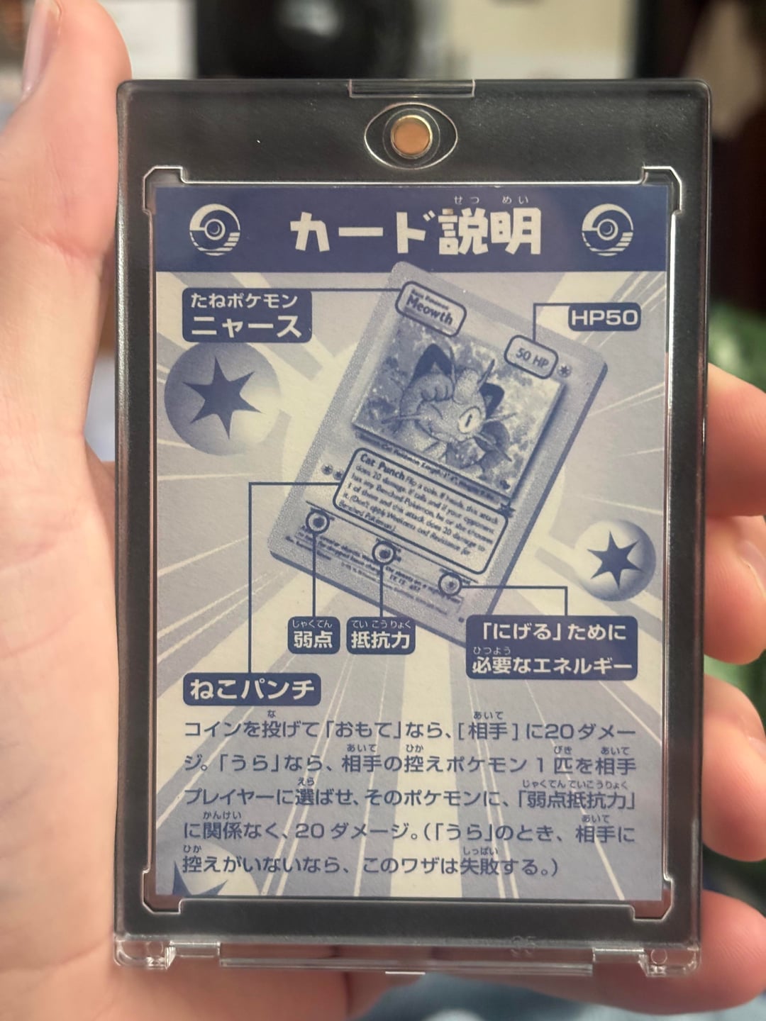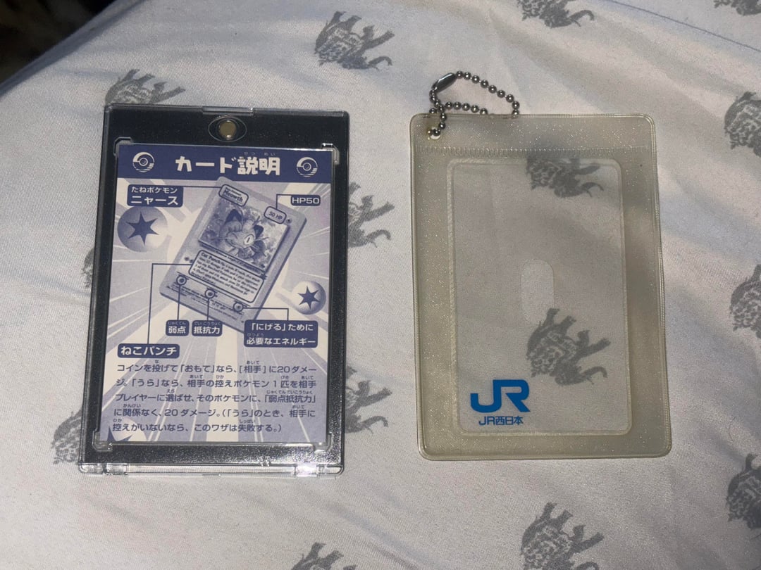 Don’t worry it’s sleeved lol, Not many people know about this variant, it’s the Japanese release 2000 JR West Stamp Rally NON-HOLO version of the meowth WOTC black star promo. Definitely the most rare variant of all the Wizards era black star promos. It was given out to people as a prize after they completed both sets of stamps from the gold and silver JR train line stamp courses. (gold line completion rewarded non-holo eevee and silver completion rewarded mewtwo, both black star promo variants sealed in a little booklet) All three differing from the regular WOTC versions. The lesser-known meowth never came sealed it just came in the card holder as pictured, with the little detail card telling about it (that I have in the back of the case). It also came with a set of stickers and some movie film frames, as well as a little book/pamphlet (going to get those as well when I can find them) I’ve been working for years on a very thorough master set of the WOTC black star promos plus all other Wizards era Pokémon promos, including a binder set and all original sealed distribution methods besides the 25 card cello packs, the 8 card cello packs for best of game, and the 4 card E3 pack of Kirby/manhole/japanese back English front hoppip and pichu. I will be posting it soon when I get the time, I was able to get the last two variants I’ve needed recently, this one and the 1st edition stamp Ivy Pikachu #1.