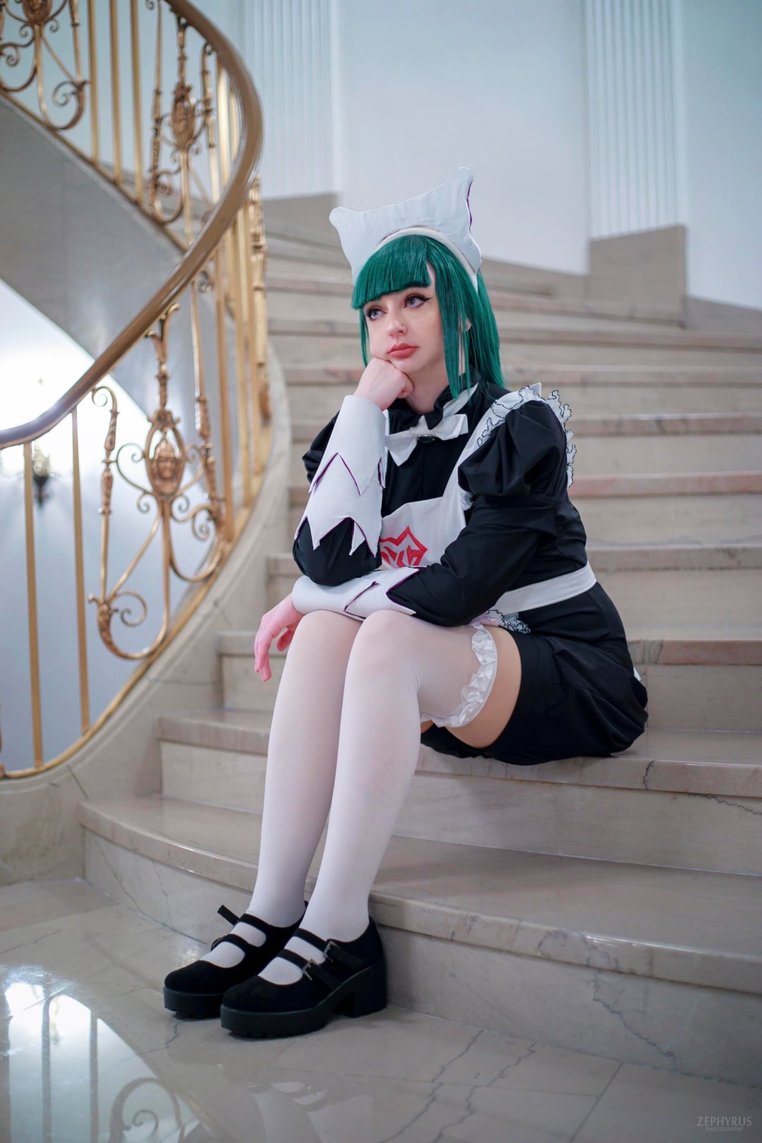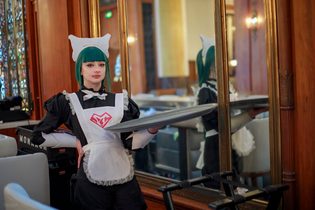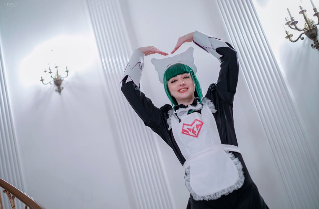 This was my first attempt at making an entire cosplay (minus leggings and shoes. I’m not a cobbler yet…)and I think it went pretty well! I sewed the entire outfit (minus the leggings, though they are leggings and stockings hand sewn together so they wouldn’t fall down all day at the convention). And made the maid hat? and her gauntlets with EVA foam, then wrapped them in the same fabric as the apron.