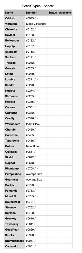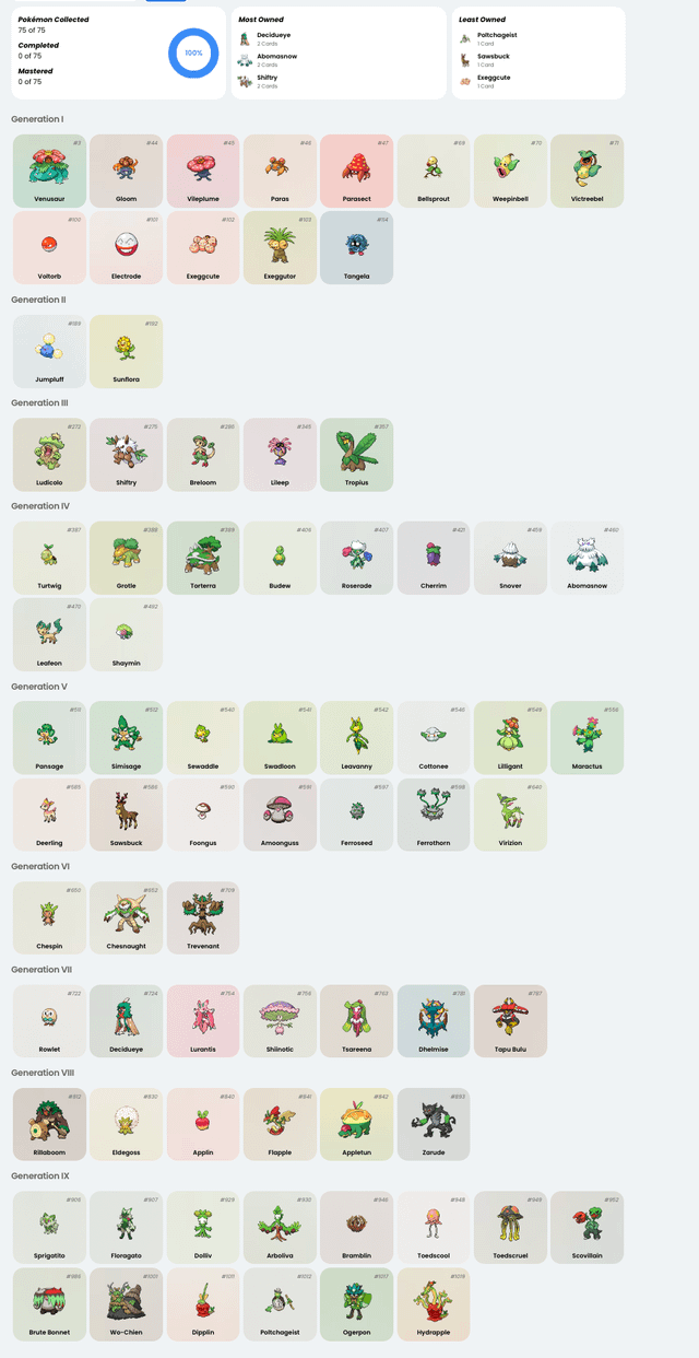 I just started collecting cards, and I had this goal of building a full art binder of grass types (currently I'm ignoring pure bug types, I know they are labeled as grass but I grew up playing the games so I just see metapod as a bug type haha).