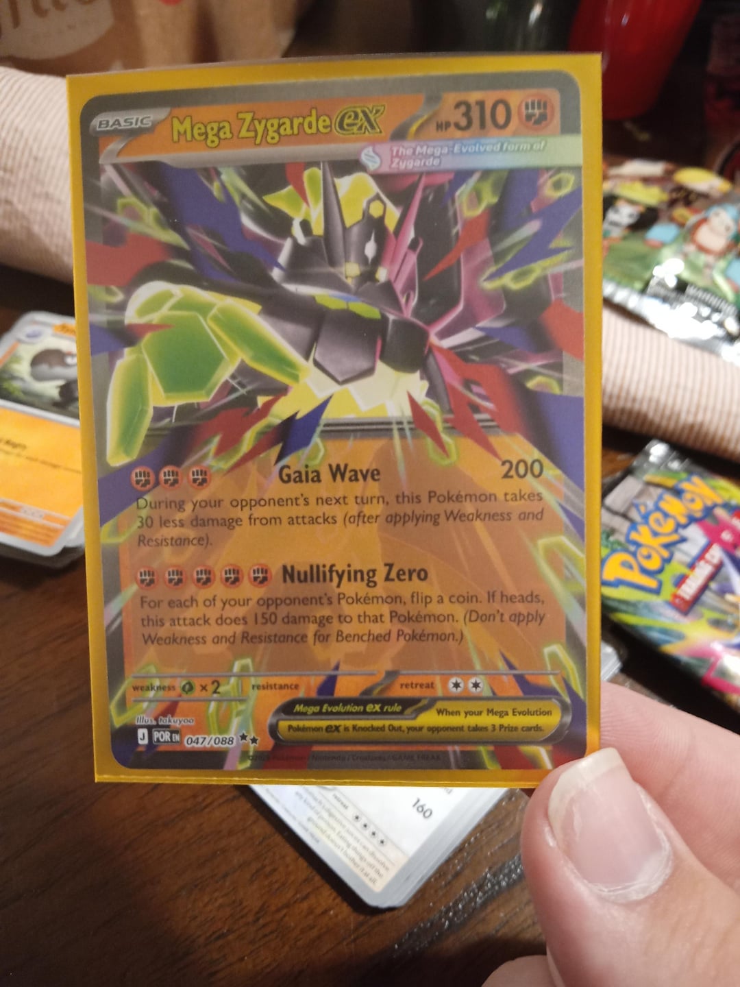 I found like around 100 packs in a little corner at my local Walmart I got six packs and the most notable card I got was mega zygarde from my last pack and I was hoping I got one of the new megas and I was blown out of the water with the last pack I opened.