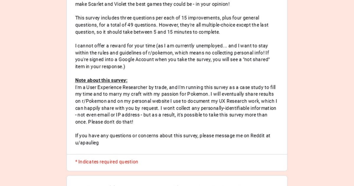 I love Pokemon and I’m a (currently unemployed) User Experience Researcher professionally. I want to combine that love and that career – at least in a demo study. As such, I’d be hugely grateful if you could take my survey on how to improve Scarlet and Violet in an ideal future.